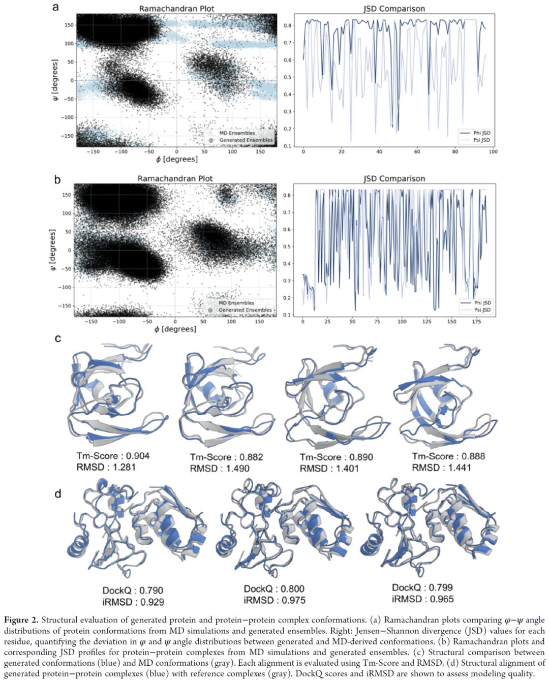PTraj-Diff 可生成与 MD 模拟高度一致的构象分布,同时显著扩展采样空间。Ramachandran 图显示模型在 500 ns 轨迹数据训练后能有效学习蛋白的柔性区域。生成轨迹的均方波动(RMSF)与 MD 模拟吻合,表明模型捕捉了关键动力学特征。叠合分析进一步证明其在全局折叠与界面构象上的精确度。