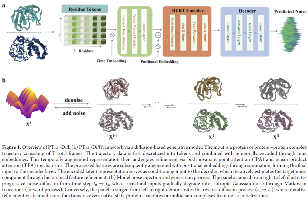 PTraj-Diff 框架基于扩散生成原理构建,通过时间条件化的网络捕获不同构象状态间的时间依赖,实现连续轨迹的生成。其主要创新包括: