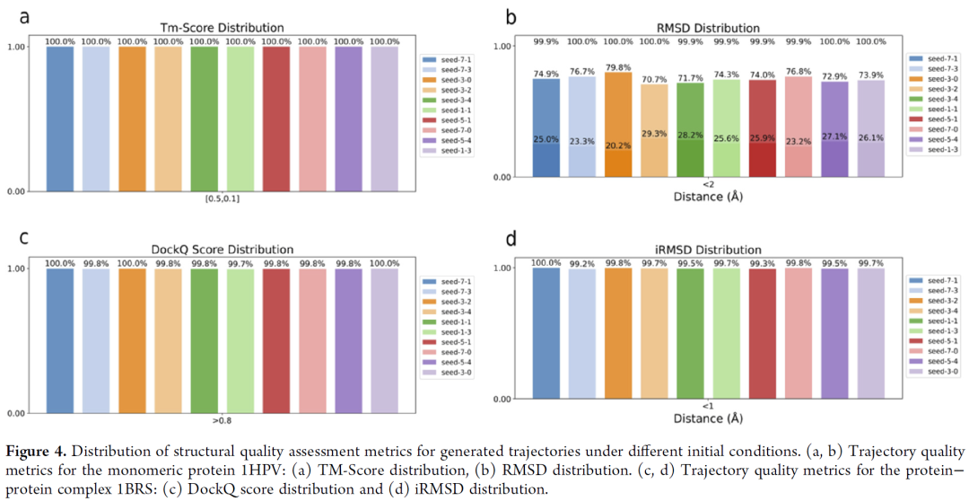 研究人员在两种体系上进行了性能测试:单体蛋白 1HPV 与复合物 1BRS。结果显示,所有 1HPV 预测构象的 TM-score 均在 0.5–1.0 范围内,RMSD 几乎全部低于 2 Å,表明生成结构与晶体构象高度一致。在复合物任务中,DockQ 与 iRMSD 指标分别反映了结合界面和整体匹配的优异精度,超过 96% 的样本处于高质量区间。