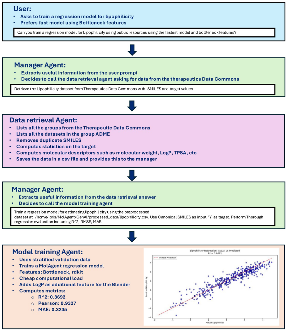 为展示代理间在应答任务时的通信与动作流程,作者向框架提出如下请求:“你能否利用公共资源、以最快的可用模型并结合bottleneck特征训练一个脂溶性的回归模型?”。图2总结了多智能体框架中各代理之间的交互步骤,并展示了最终输出结果及性能图。