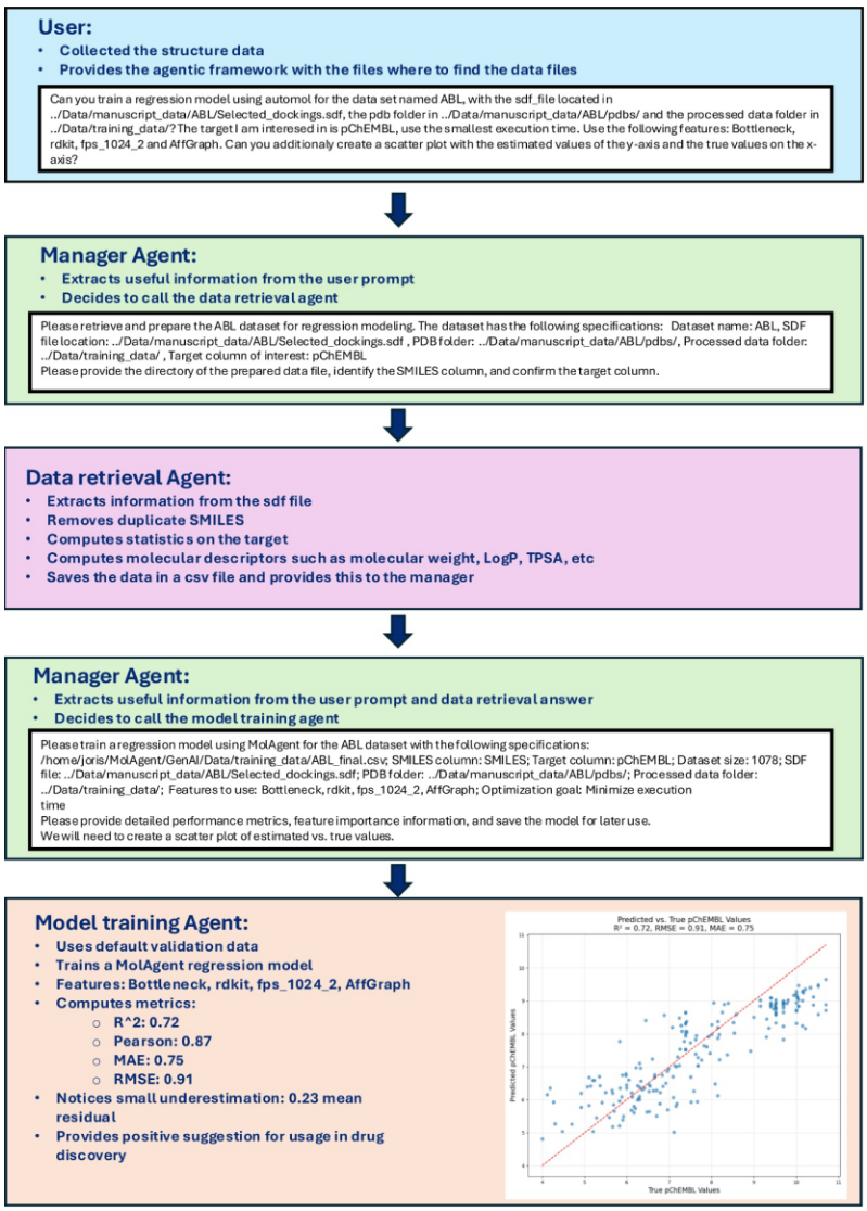 进一步利用MolAgent构建了一个针对酪氨酸蛋白激酶 ABL1的回归模型,并在建模流程中显式引入了三维结构。为使框架能够利用3D结构信息,作者为AI系统提供了清晰可访问的数据集路径。图3展示了该框架在接收输入指令后所执行的详细步骤,并说明了三维特征建模如何无缝嵌入整个代理式工作流中。