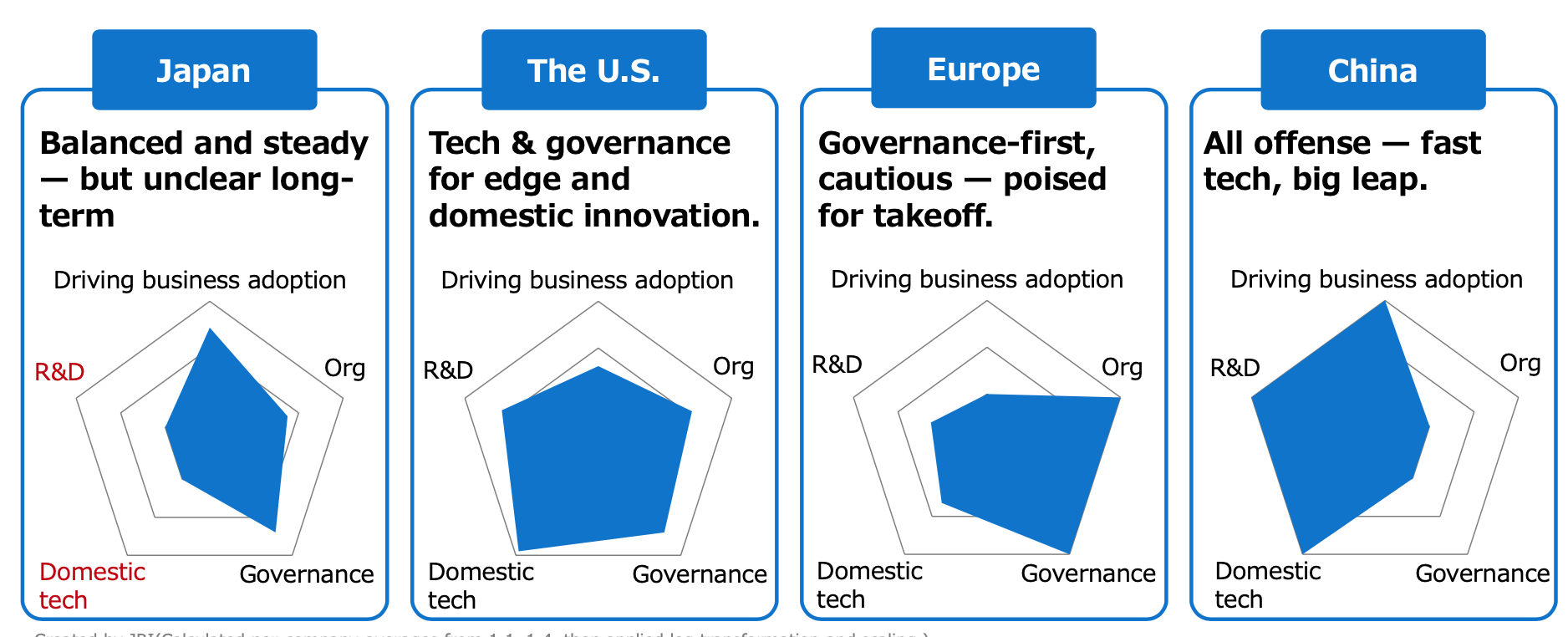 The Japan Research Institute通过对日本、美国、欧洲和中国顶级金融机构的案例研究分析(本文的PDF版本及The Japan Research Institute(日本総研)所发布的报告全文已收录至走向未来【https://t.zsxq.com/xpWzq】知识星球,推荐加入该星球获取资料以及更多人工智能领域的资料),清晰地得到四种截然不同的发展模式。美国展现出积极进取的姿态,以技术和治理为核心驱动力。中国正以惊人的速度进行全面部署,强调国内技术自主和快速应用落地。欧洲则采取了治理优先的谨慎策略,在严格的监管框架内稳步推进。日本则呈现出一种平衡而稳健的态势,在业务采用和治理方面表现良好,但在核心的自主研发和国内技术生态建设上,显露出令人担忧的滞后。