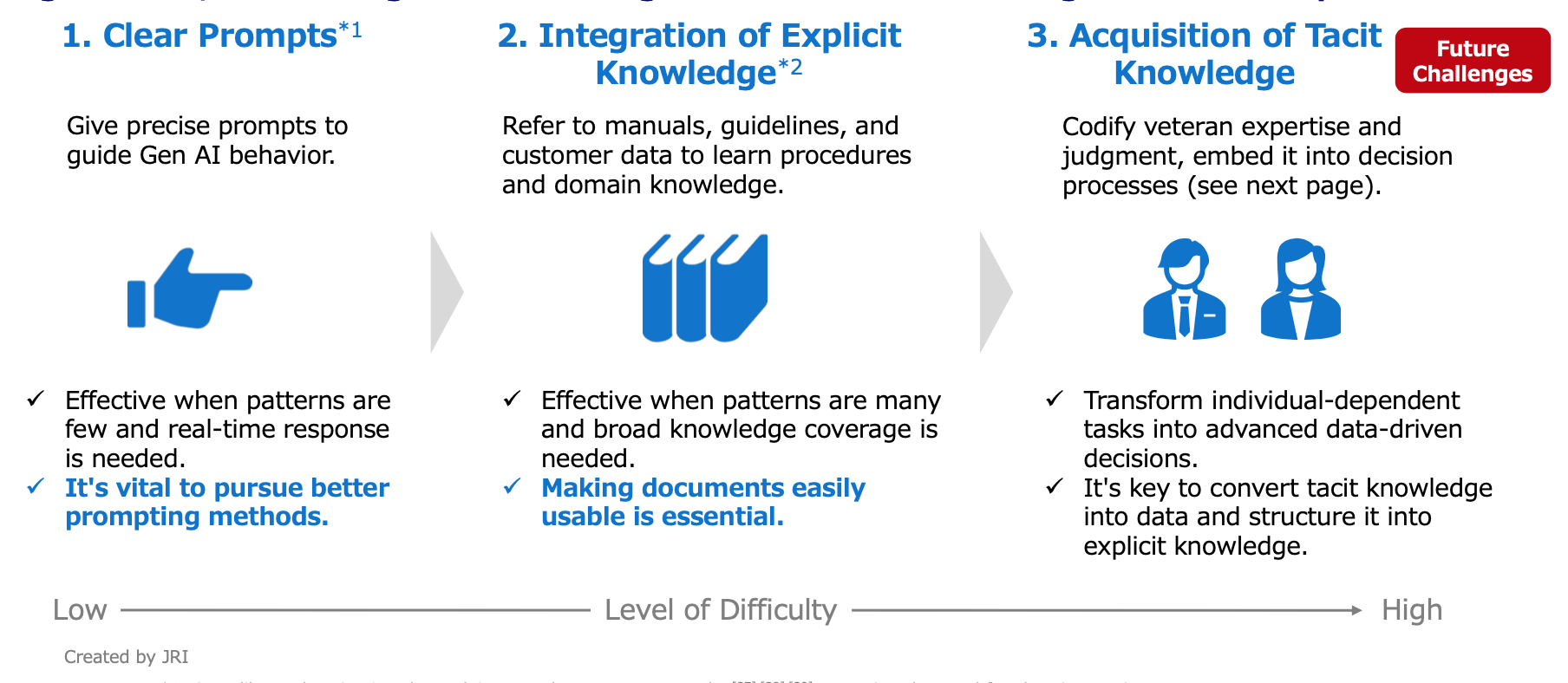 目前,AI的应用主要集中在两个层面:一是通过清晰的提示词(Prompts)来指导AI行为;二是通过检索增强生成(RAG)等技术(见该书第4章检索增强生成),将手册、指南和客户数据等显性知识与AI模型集成。这在处理有明确规范和广泛知识覆盖的场景中非常有效。