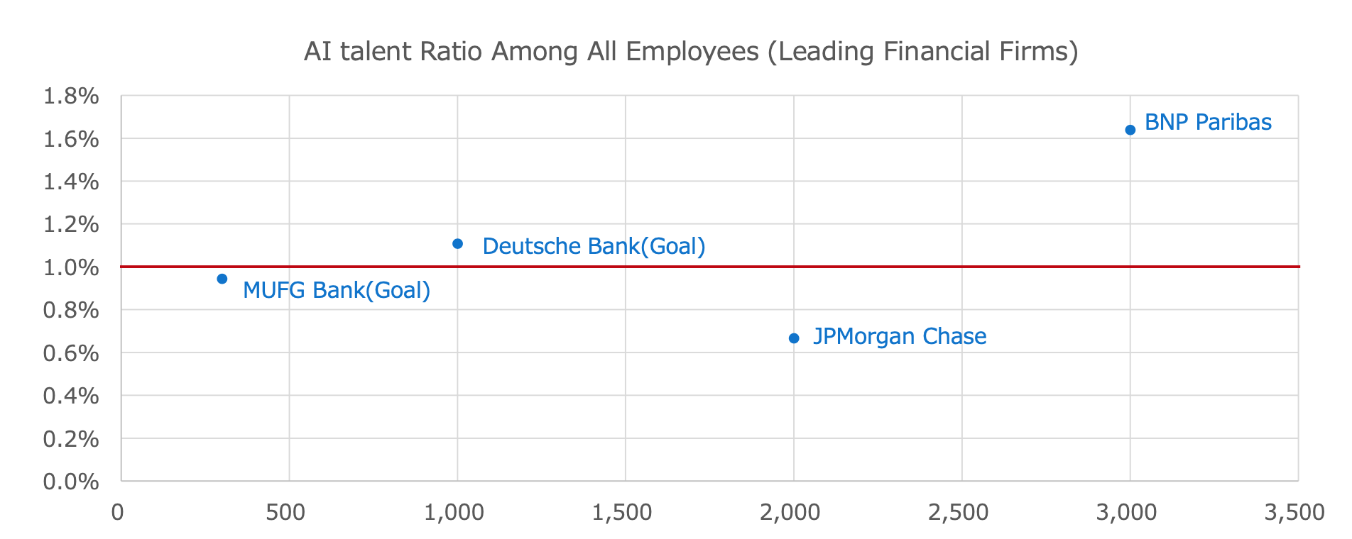 那么,到底需要多少AI人才?通过对三菱UFJ、德意志银行、摩根大通和法国巴黎银行等机构的分析,一个可供参考的基准浮出水面:AI人才(包括数据科学家、工程师、分析师等)的数量,应占到公司总员工数的1%左右。例如,三菱UFJ计划在未来三年内将AI人才从100人扩大到300人,而德意志银行的目标是1000人。