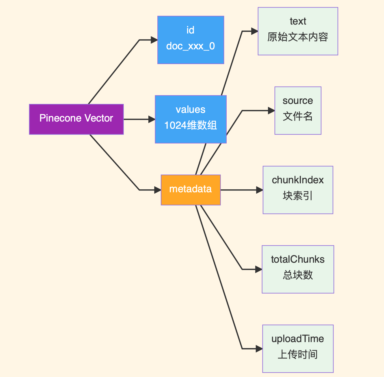 元数据 | source, chunkIndex, totalChunks, uploadTime | 支持溯源和分块顺序重建 |