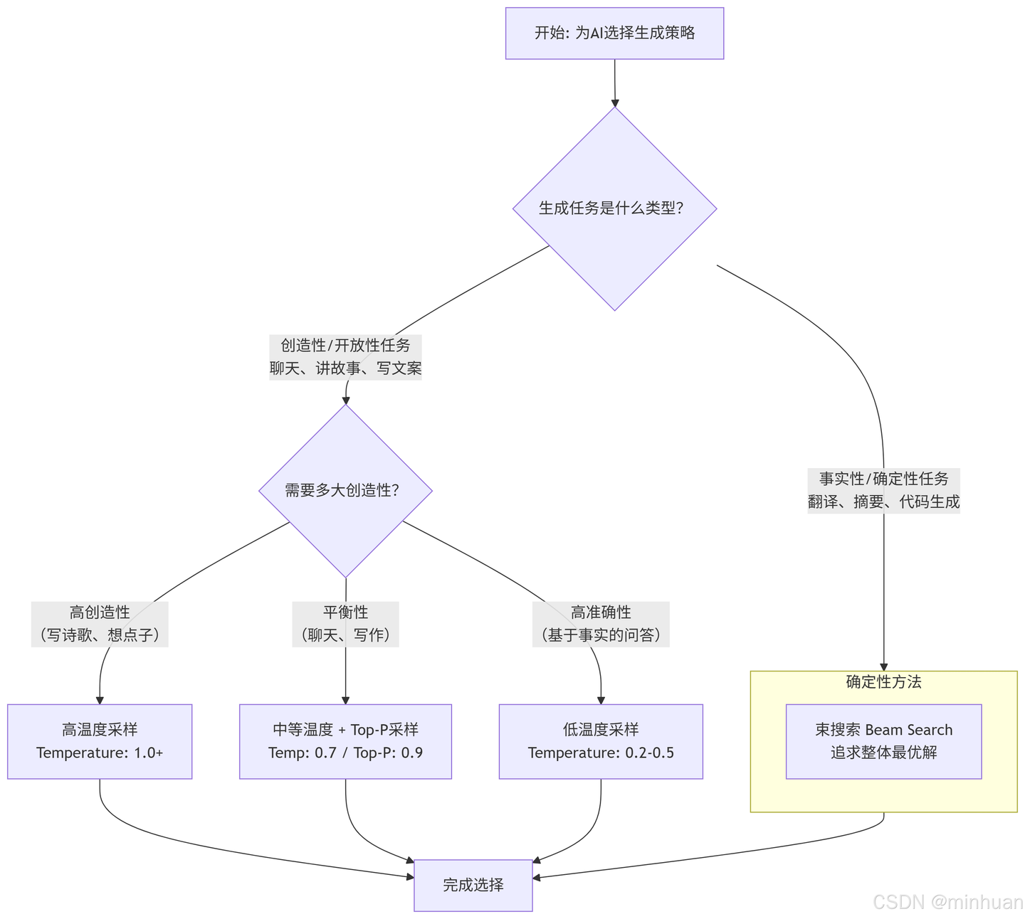 Top-p采样 | 从累积概率超p的词中选 | 动态灵活,智能 | 需手动调参 | 创造性生成(首选) |