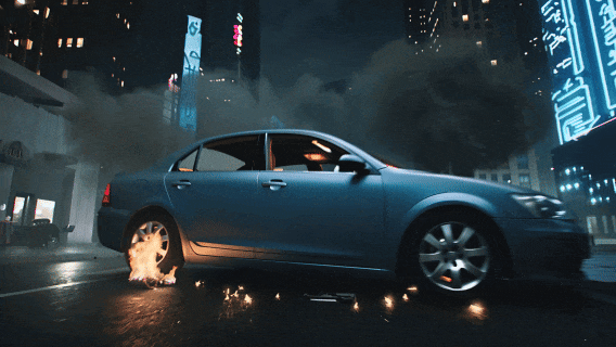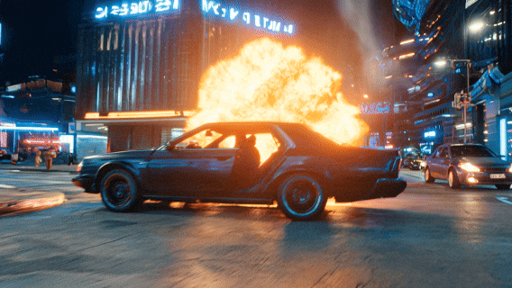 提示词:霓虹都市背景,车辆爆炸,火光四起,黑衣特工从车中飞跃而出,翻滚落地,然后迅速爬起,左手右手同时举枪开火,镜头跟随特工运动,最后环绕特工360度旋转。