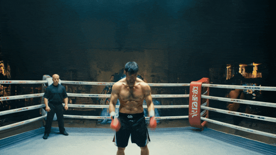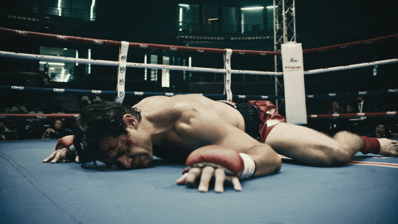 提示词:克林顿伊斯特伍德风格,一名拳击手被击倒在地,镜头360度旋转,定格在拳击手的脸部特写镜头,他满脸伤痕,晕眩,疲惫,近乎绝望。但是,他深吸了一口气,咬紧牙关,用手撑着颤抖的身体,一点点站了起来。晃动镜头跟随。眼神变得坚定,带着不屈的力量。