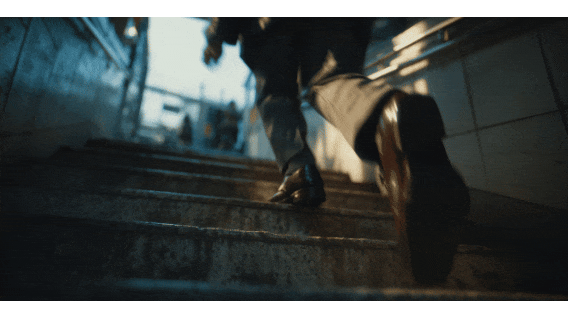 提示词:他跨上最后一级台阶冲出地铁口,逆光里捕到前方那道模糊人影正要拐走,他猛地加速追过去,镜头跟随。