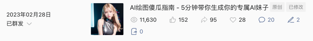 但是没想到的是,我发布的第二篇文章,就是关于Stable Diffusion画美女的教程,这篇文章竟然突然爆了,阅读量破了万,也为我积累了最初的500个粉丝。