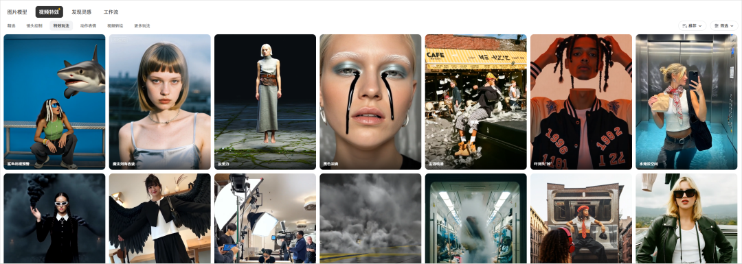 而且,他们还做了特效模板功能,你也能在上面找到各种各样的特效模板,一键复刻,效果还不错,有点海外的很火的那个higgsfield的感觉。