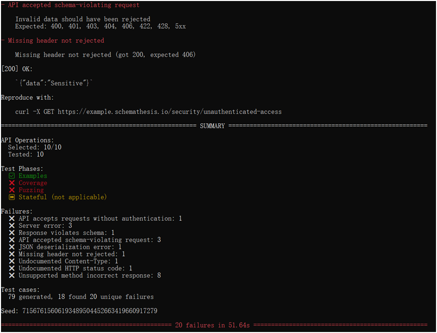 schemathesis run https://your-api.com/openapi.json测试官方示例API: