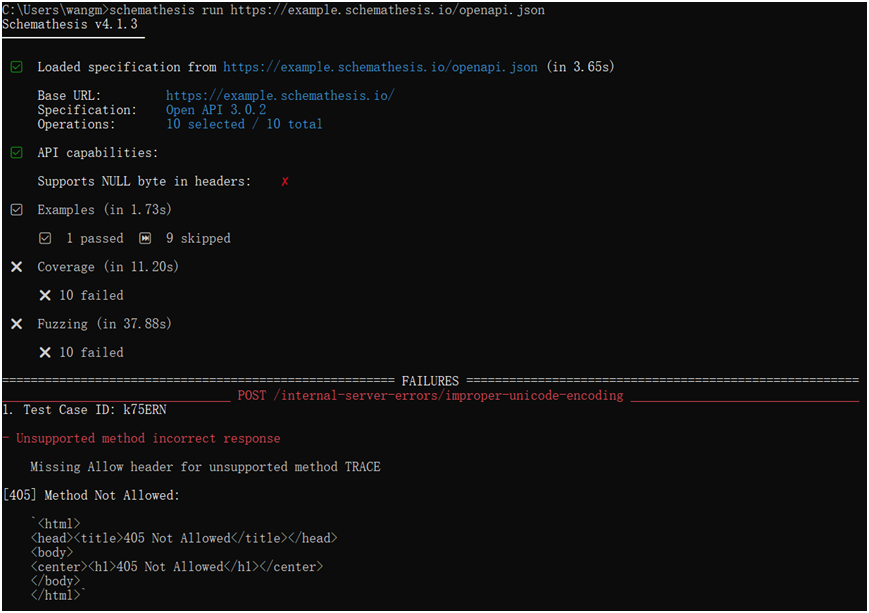 uvx schemathesis run ./openapi.yaml --url http://localhost:8000./openapi.yaml:本地API的schema文件路径。