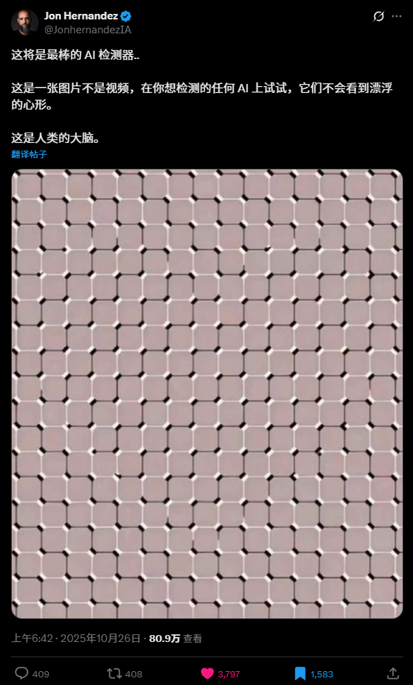 这哥们说,这是最好的AI探测器,说,没有AI能看到这个图中间还有个爱心。