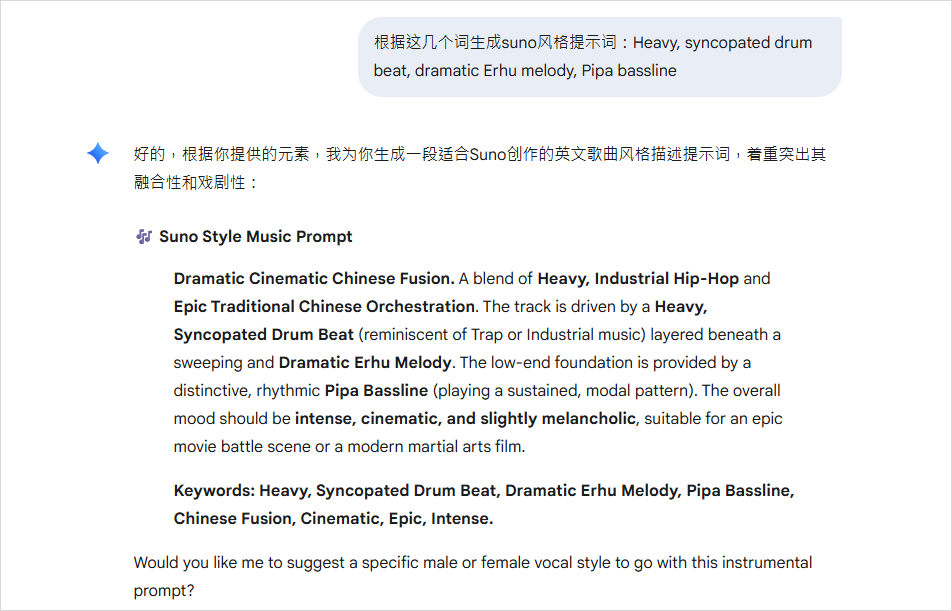 因为Gemini真的非常擅长生成Suno的提示词,所以我直接用一种,简单近乎简陋的方式给它安排了任务。