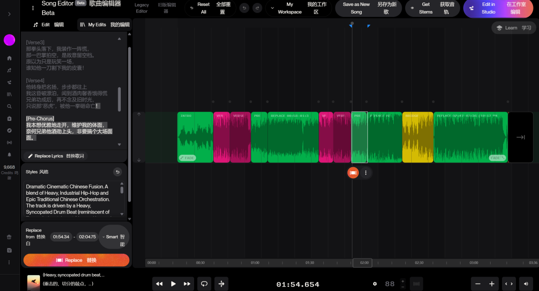 有两个比较常见的问题,一个是Suno偶尔会说一些烫嘴中文,另一个是对于歌曲中的某一段不满意,需要修改。