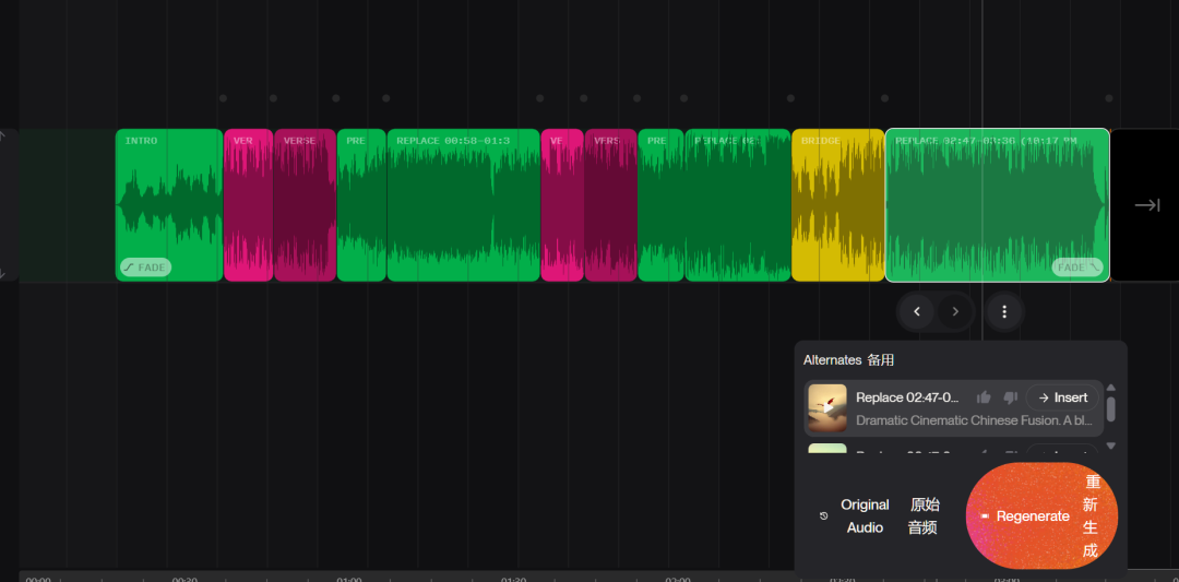它会把歌曲按照不同段落直接给你分好,这样你想改副歌就改副歌,想改间奏就改间奏,很方便。