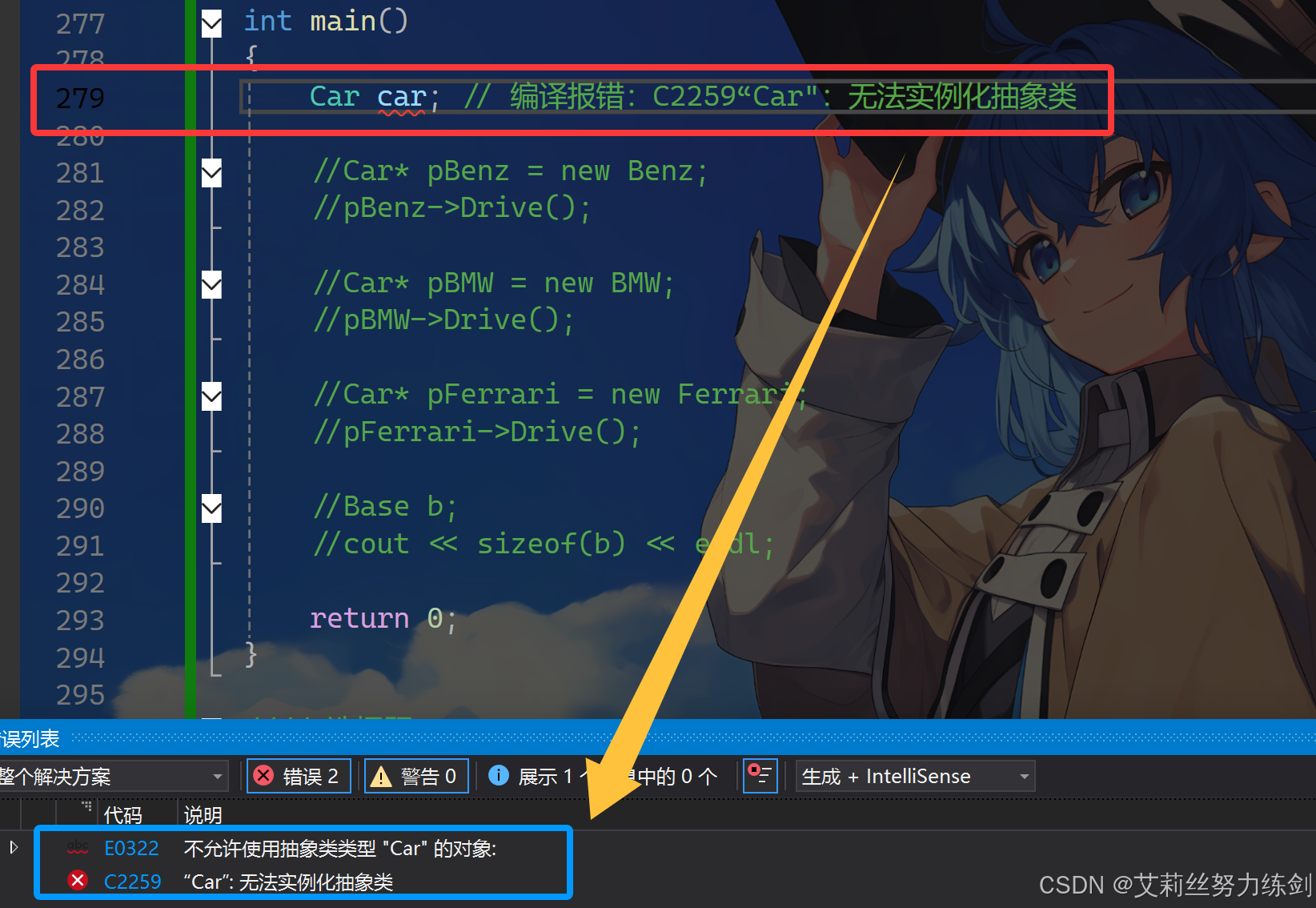 //Car car; // 编译报错:C2259“Car":无法实例化抽象类