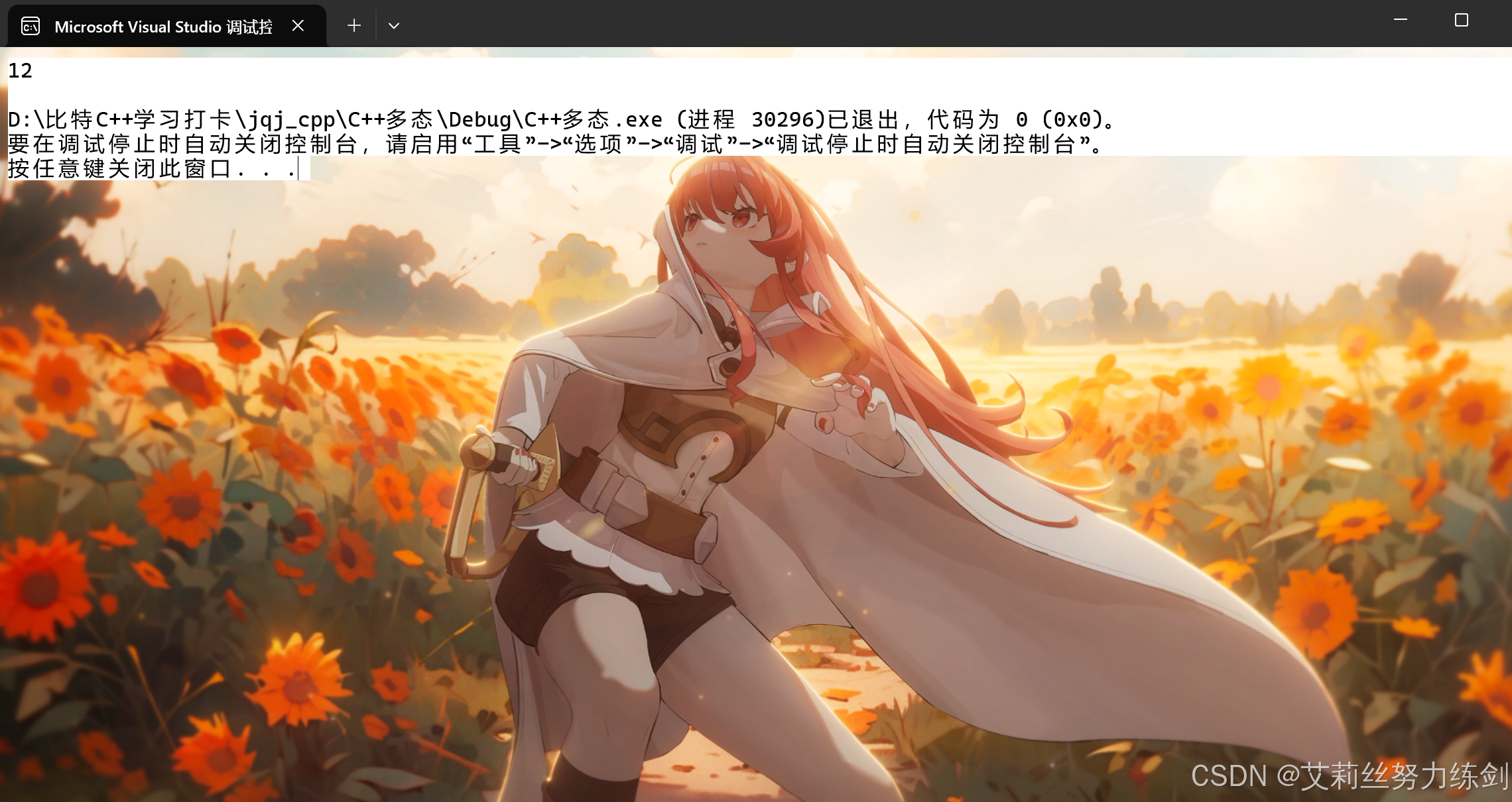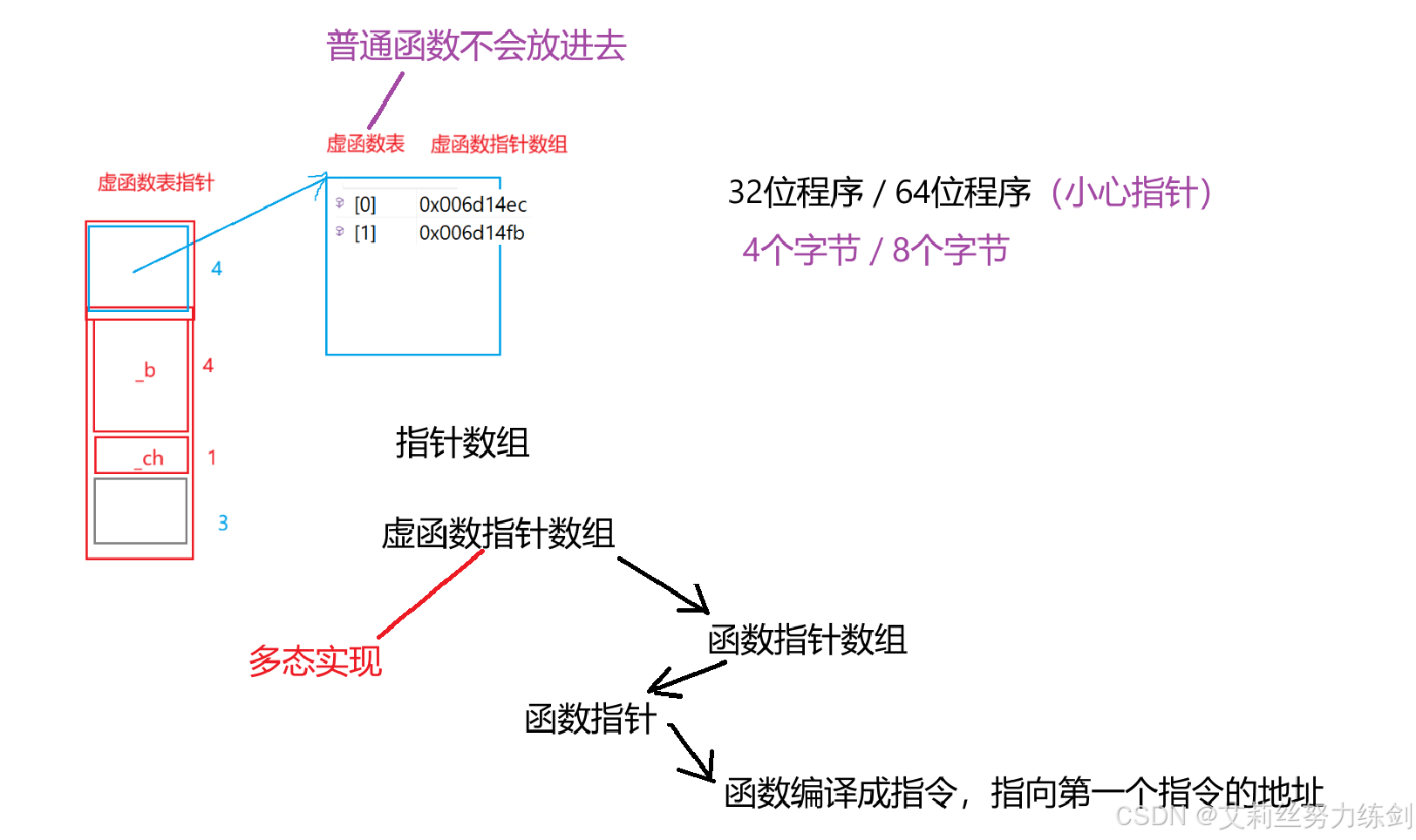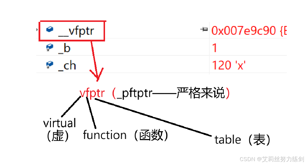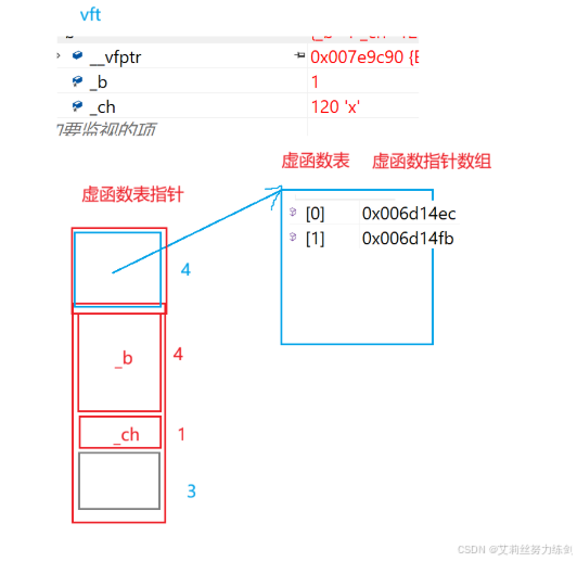 上面题目运行结果12bytes,除了_b和_ch成员,还多一个_vfptr放在对象的前面(注意有些平台可能会放到对象的最后面,这个跟平台有关),对象中的这个指针我们叫做虚函数表指针(v代表virtual,f代表function)。一个含有虚函数的类中都至少都有一个虚函数表指针,因为一个类所有虚函数的地址要被放到这个类对象的虚函数表中,虚函数表也简称虚表。