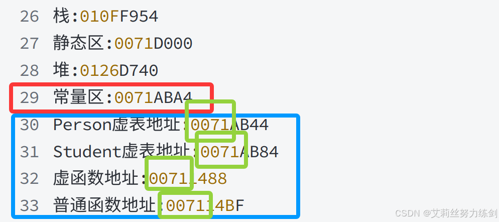 从运行结果可以看出,虚函数地址和常量区的地址十分接近,由此可知——