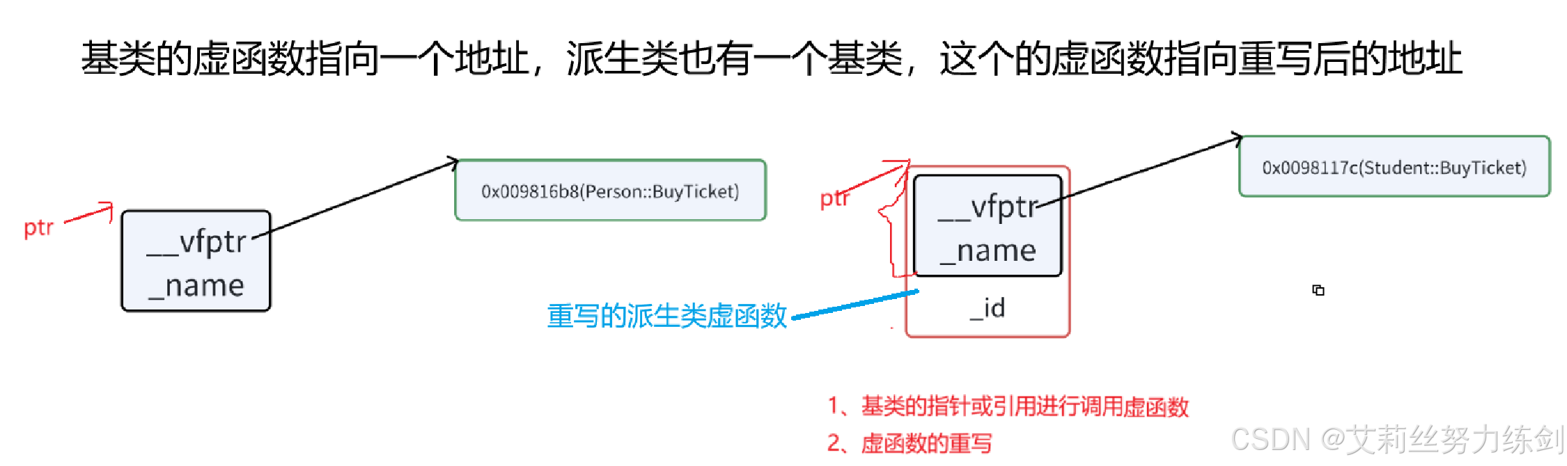 下面这张图,ptr指向Student对象,调用的是Student的虚函数——