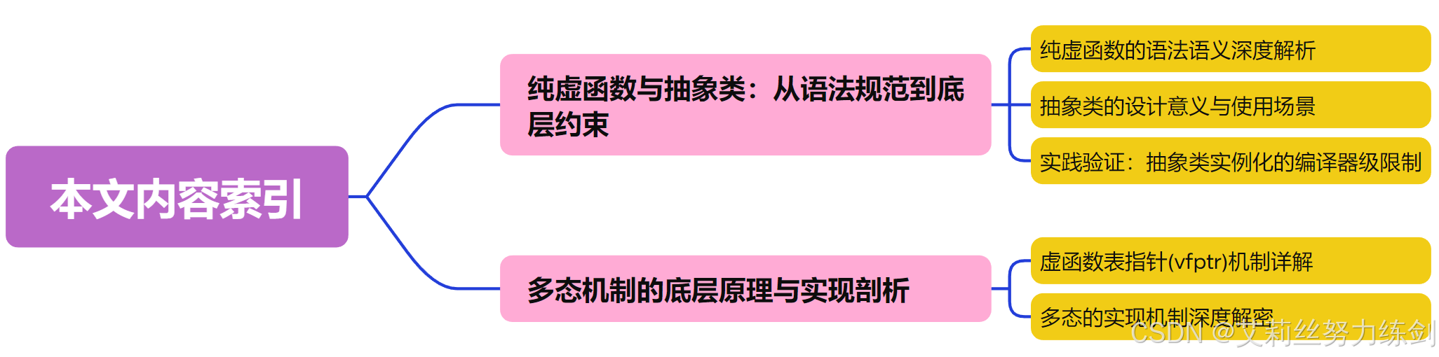 在虚函数的后面写上 = 0,则这个函数为纯虚函数,纯虚函数不需要定义实现(实现没啥意义因为要被派生类重写,但是语法上可以实现),只要声明即可。