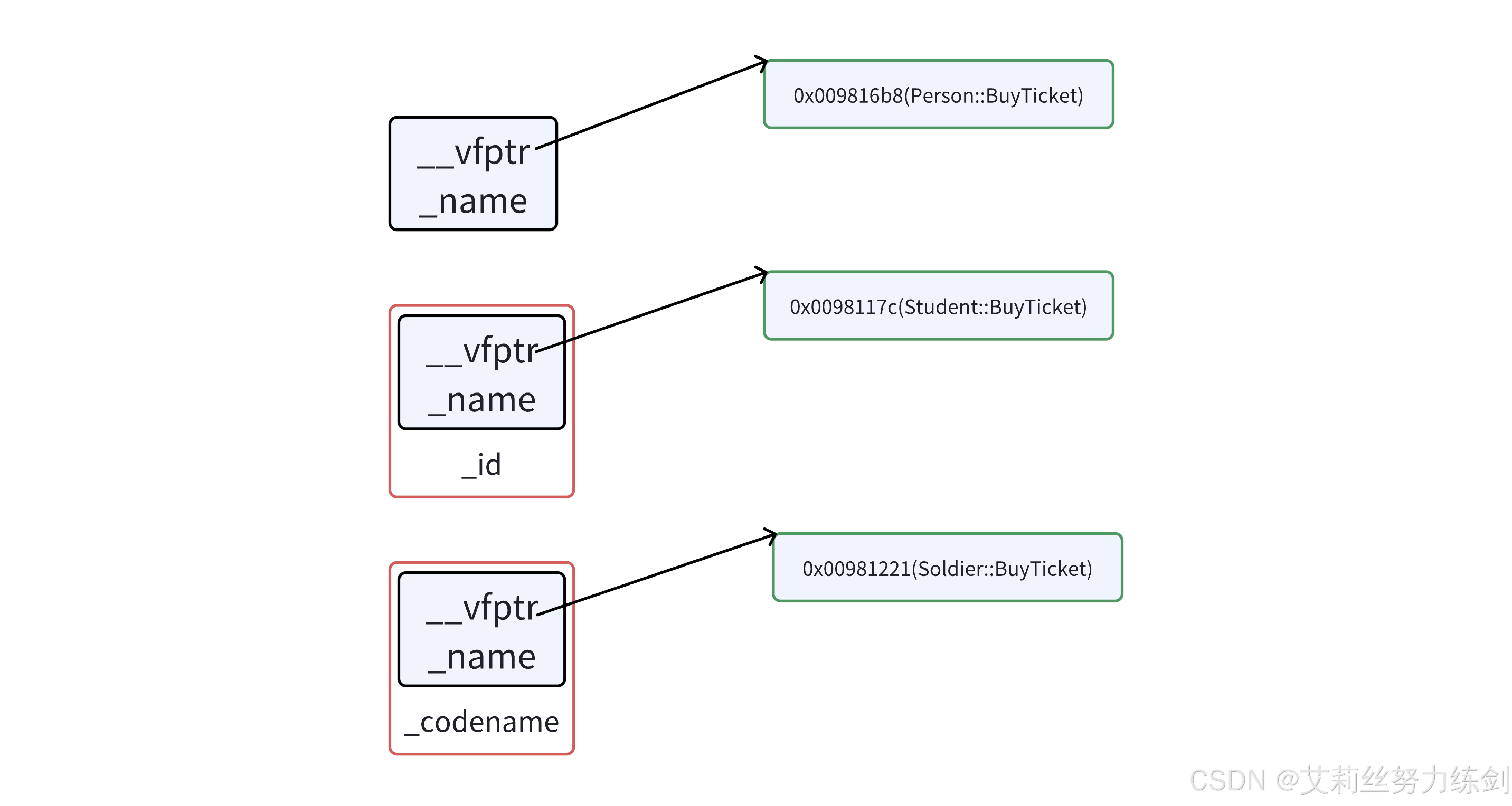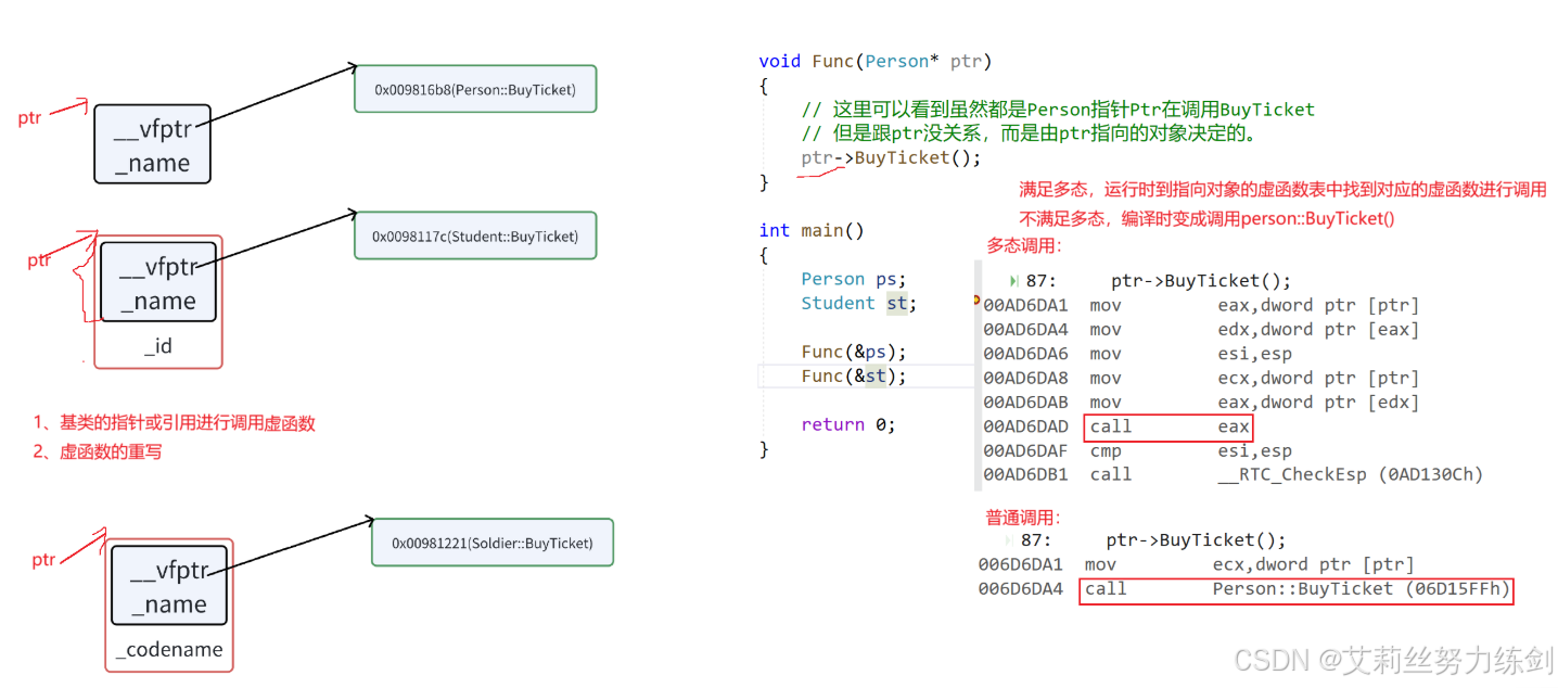 从底层的角度Func函数中ptr->BuyTicket(),是如何作为ptr指向Person对象调用到Person::BuyTicket,ptr指向Student对象调用Student::BuyTicket的呢?通过下图我们可以看到,满足多态条件后,底层不再是编译时通过调用对象确定函数的地址,而是运行时到指向的对象的虚表中确定对应的虚函数的地址,这样就实现了指针或引用指向基类就调用基类的虚函数,指向派生类就调用派生类对应的虚函数。