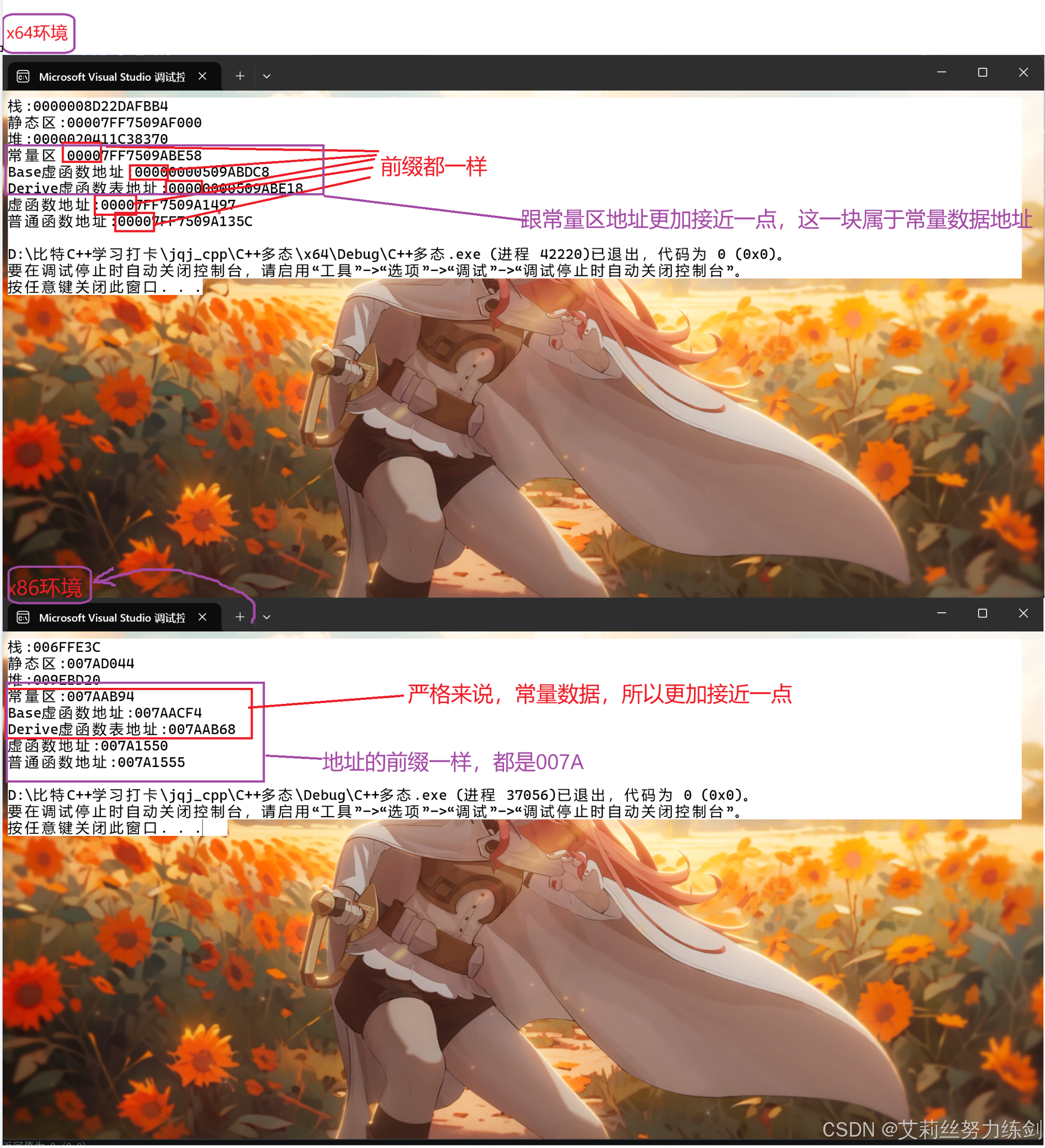 在本文的最后,艾莉丝会对比x64环境和x86环境的几个地址。