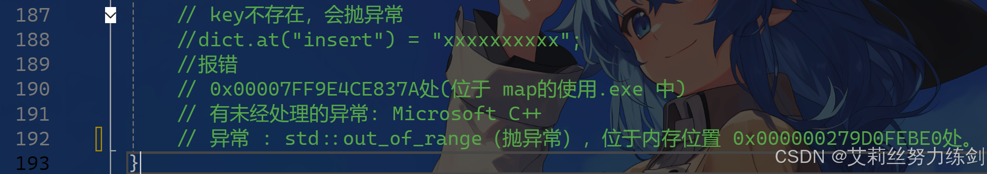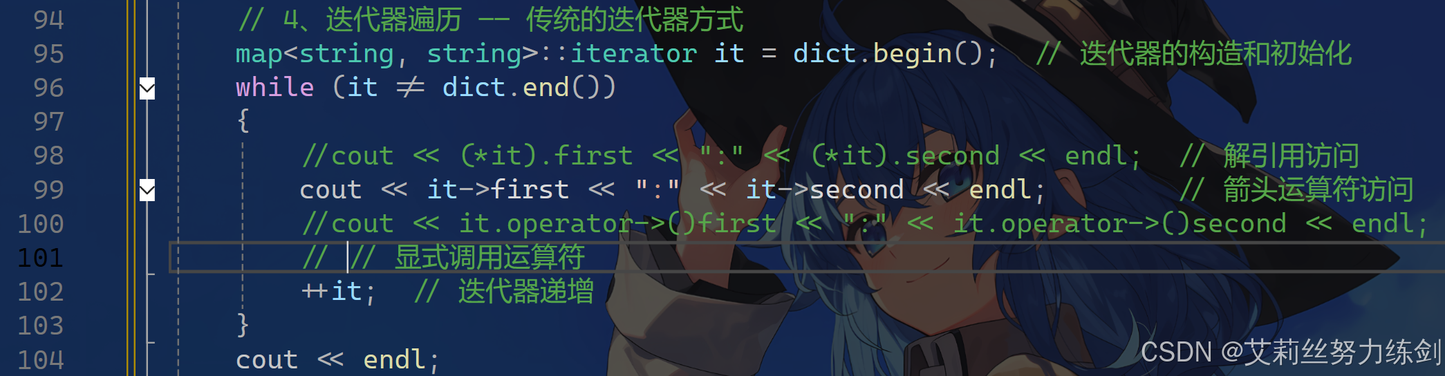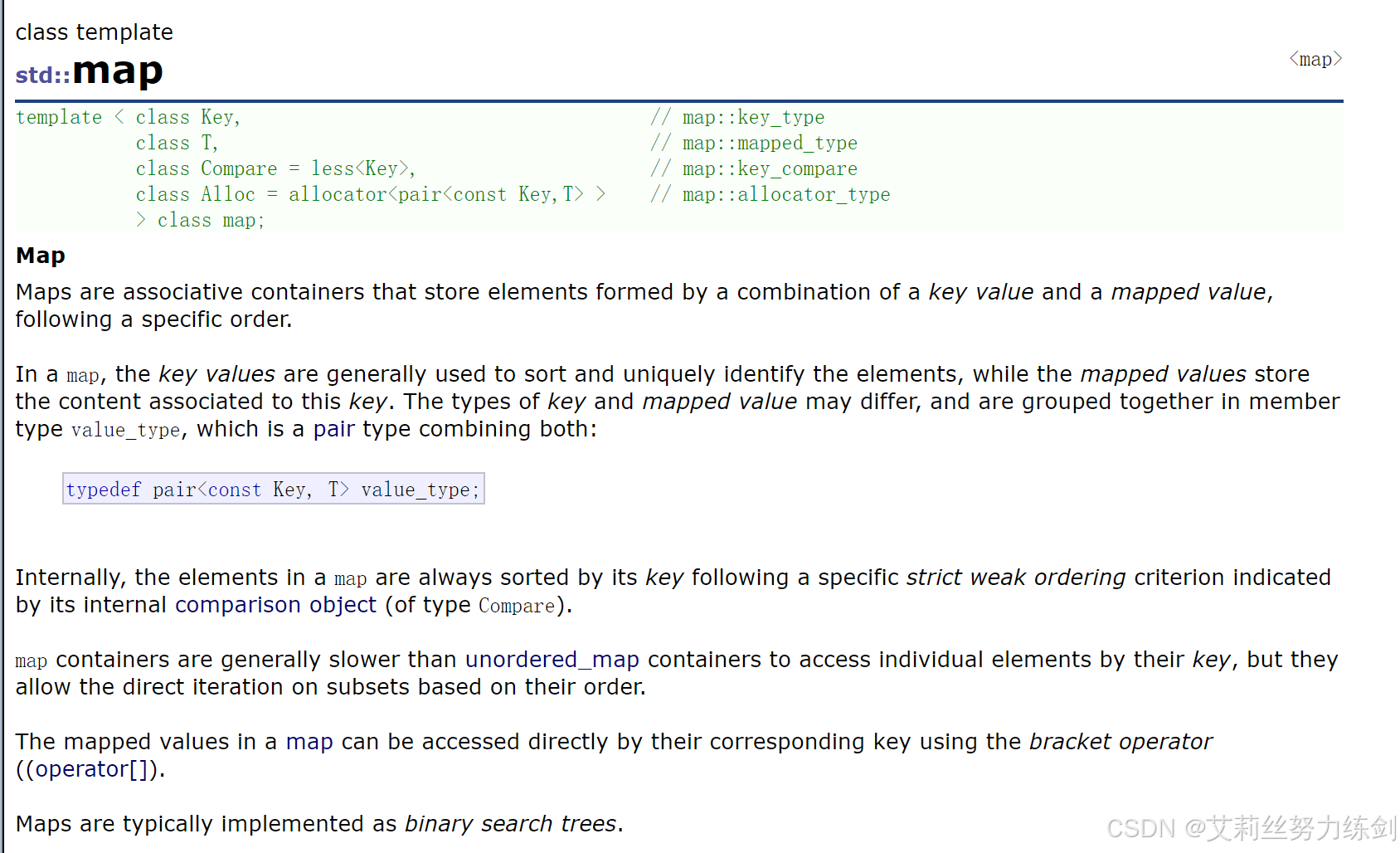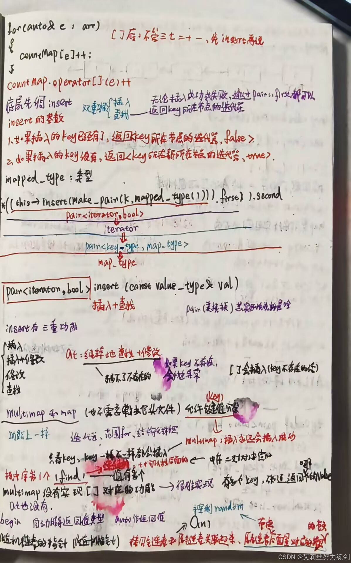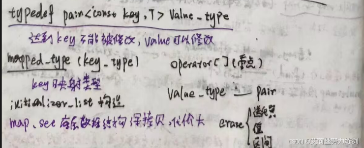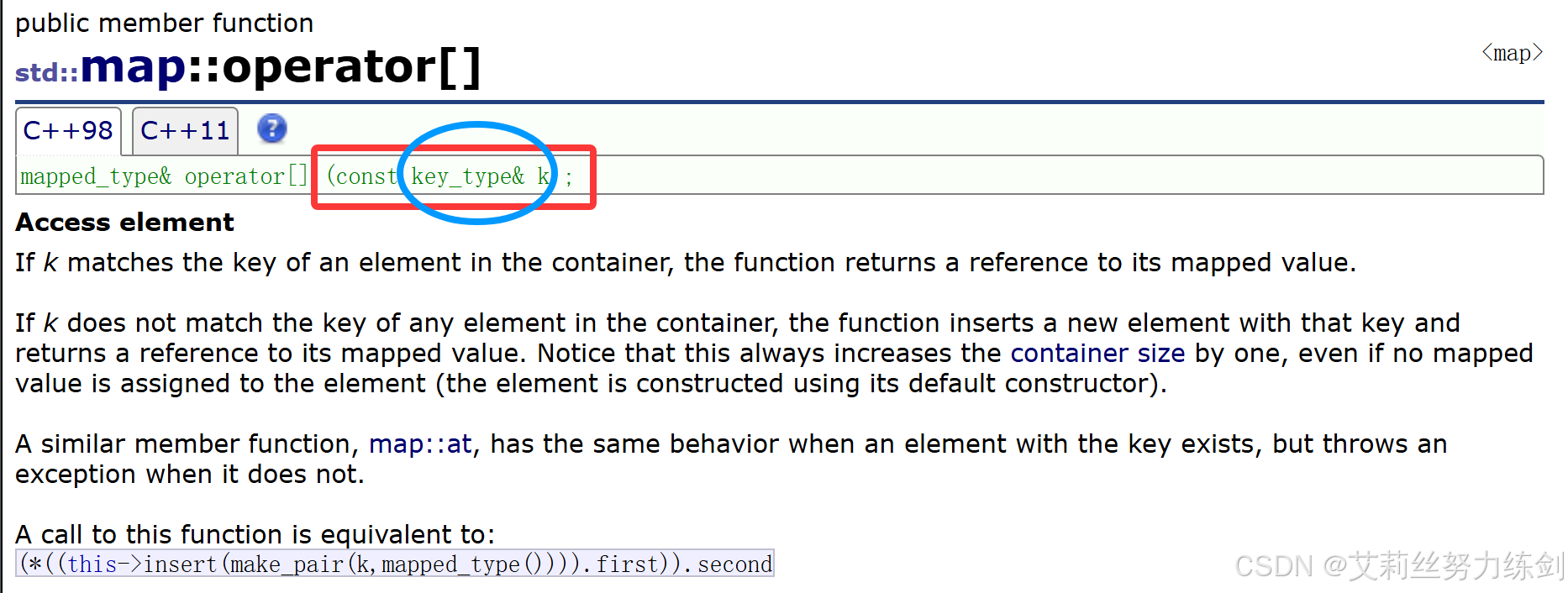 前面艾莉丝提到map支持修改mapped_type数据,不支持修改key数据,修改关键字数据,破坏了底层搜索树的结构。map第一个支持修改的方式时通过迭代器,迭代器遍历时或者find返回key所在的iterator修改,map还有一个非常重要的修改接口operator[],但是operator[]不仅仅支持修改,还支持插入数据和查找数据,所以他是一个多功能复合接口需要注意从内部实现角度,map这里把我们传统说的value值,给的是T类型,typedef为mapped_type。而value_type是红黑树结点中存储的pair键值对值。日常使用中,我们还是习惯将这里的T映射值叫做value。
