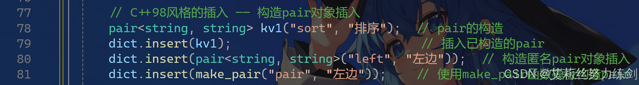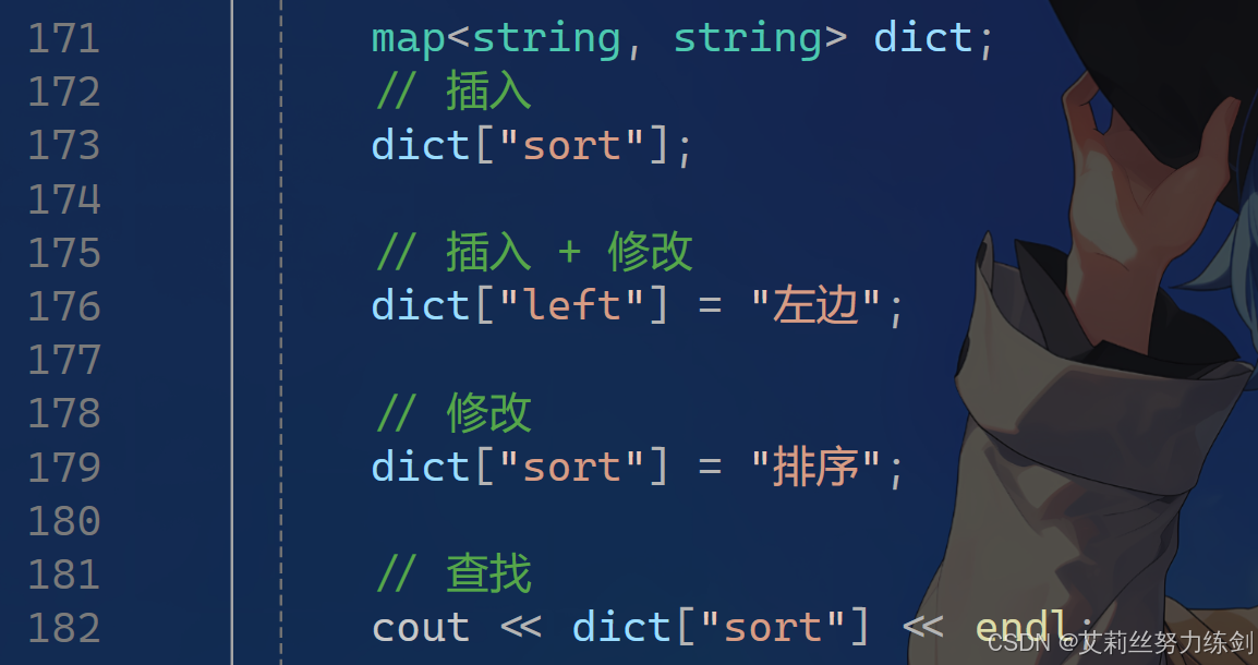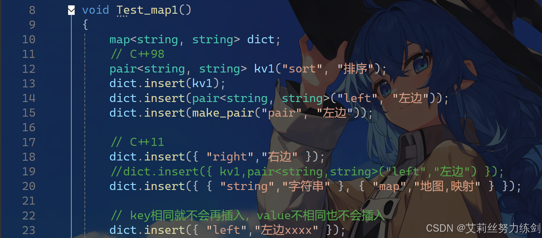 dict.insert({ { "string","字符串" }, { "map","地图,映射" } });