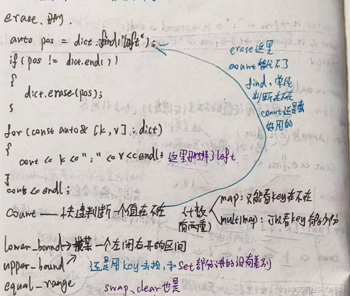 map增接口,插入的pair键值对数据,跟set所有不同,但是查和删的接口只用关键字key跟set是完全类似的,不过find返回iterator,不仅仅可以确认key在不在,还找到key映射的value,同时通过迭代还可以修改value。
