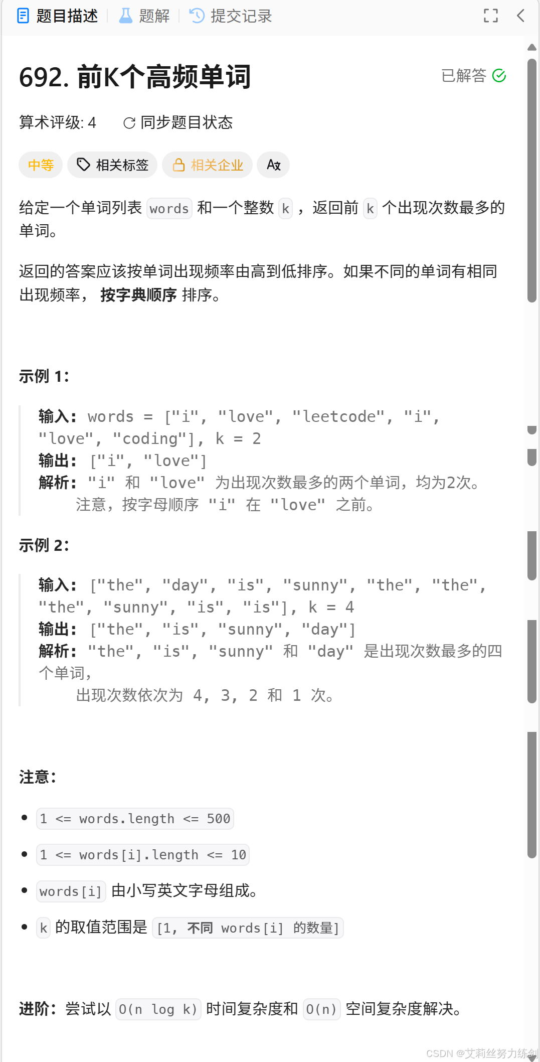 将map统计出的次数的数据放到vector中排序,或者放到priority_queue中来选出前k个。利用仿函数强行控制次数相等的,字典序小的在前面。