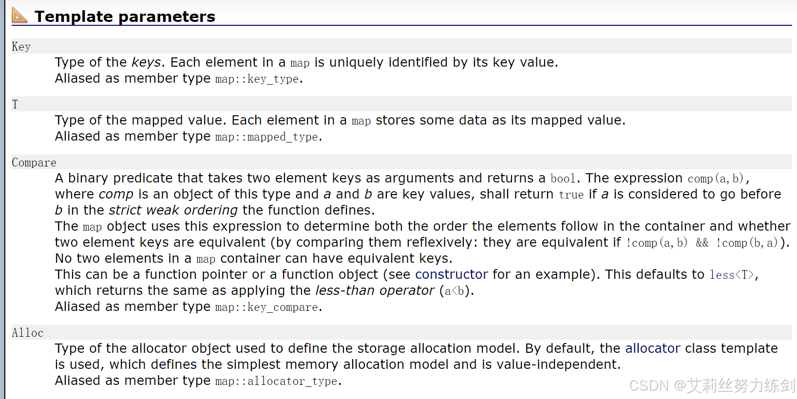 map的声明如下,Key就是map底层关键字的类型,T是map底层value的类型,set默认要求Key支持小于比较,如果不支持或者需要的话可以自行实现仿函数传给第二个模版参数,map底层存储数据的内存是从空间配置器申请的。一般情况下,我们都不需要传后两个模版参数。map底层是用红黑树实现,增删查改效率是O(logN),迭代器遍历是走的中序,所以是按key有序顺序遍历的。