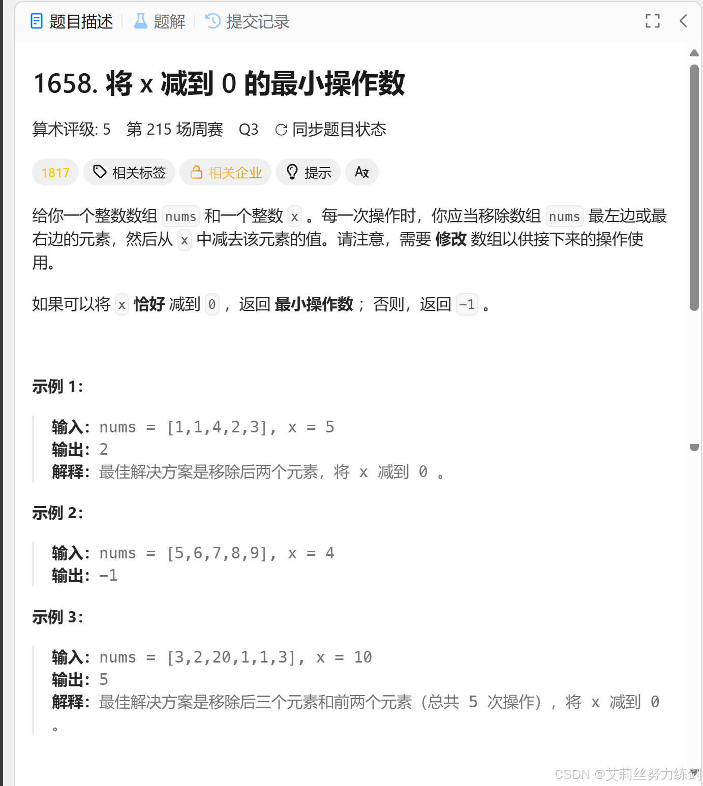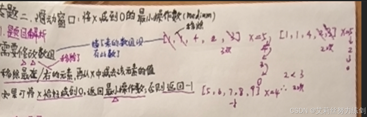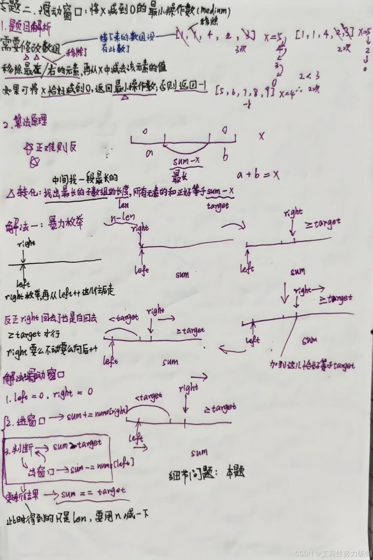 力扣题解链接:滑动窗口解决【将 x 减到 0 的最小操作数】问题