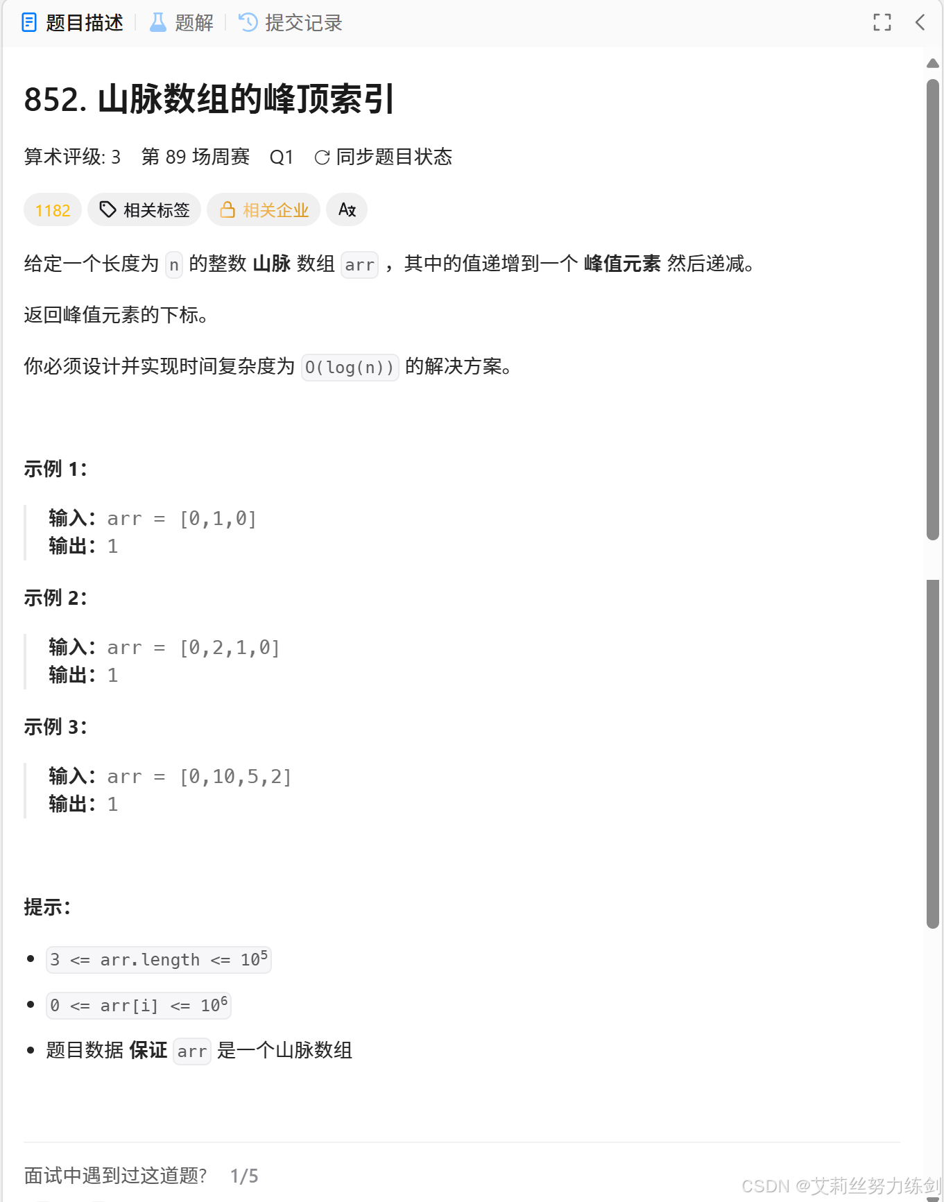 力扣题解链接:二分查找模版解决【山脉数组的峰顶索引】问题