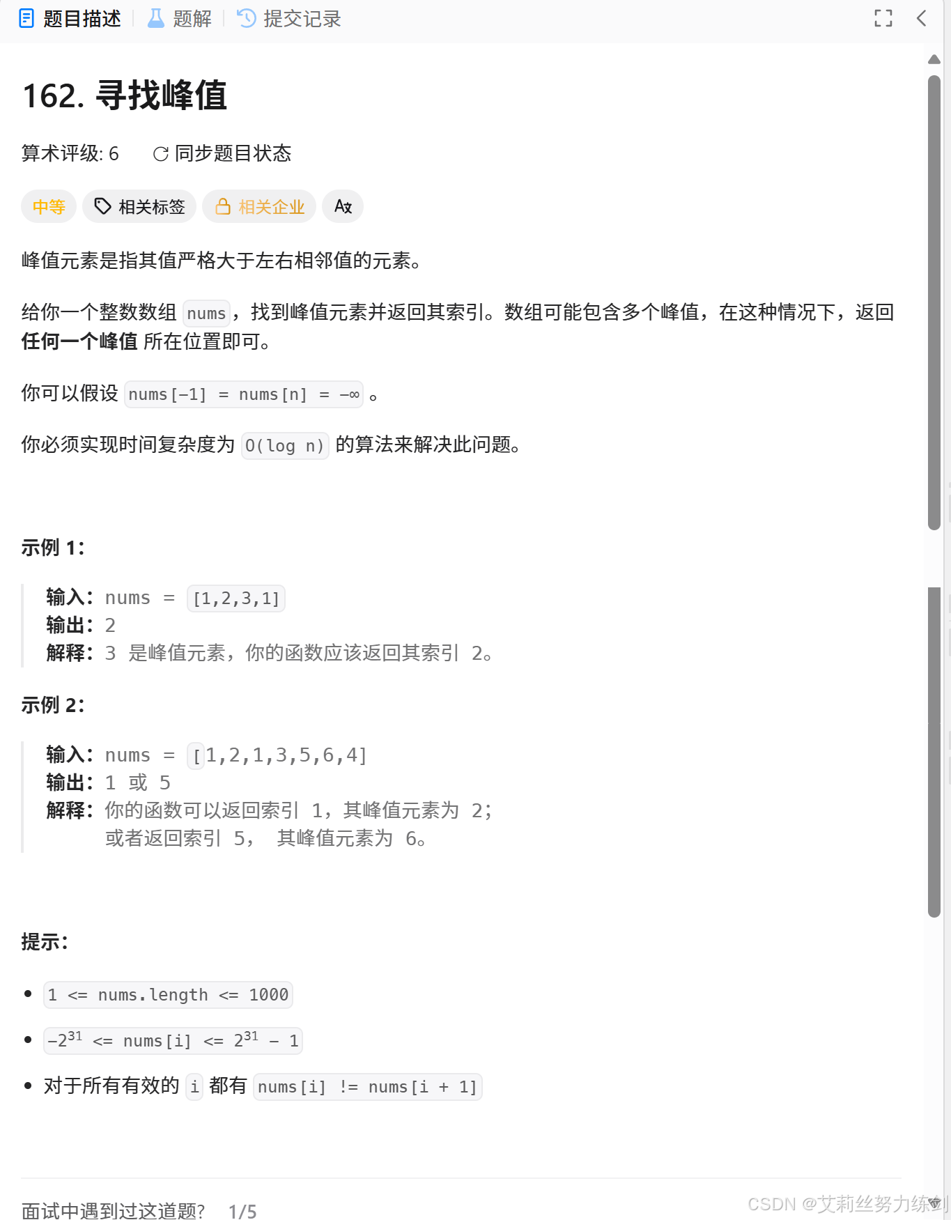 力扣链接:162. 寻找峰值