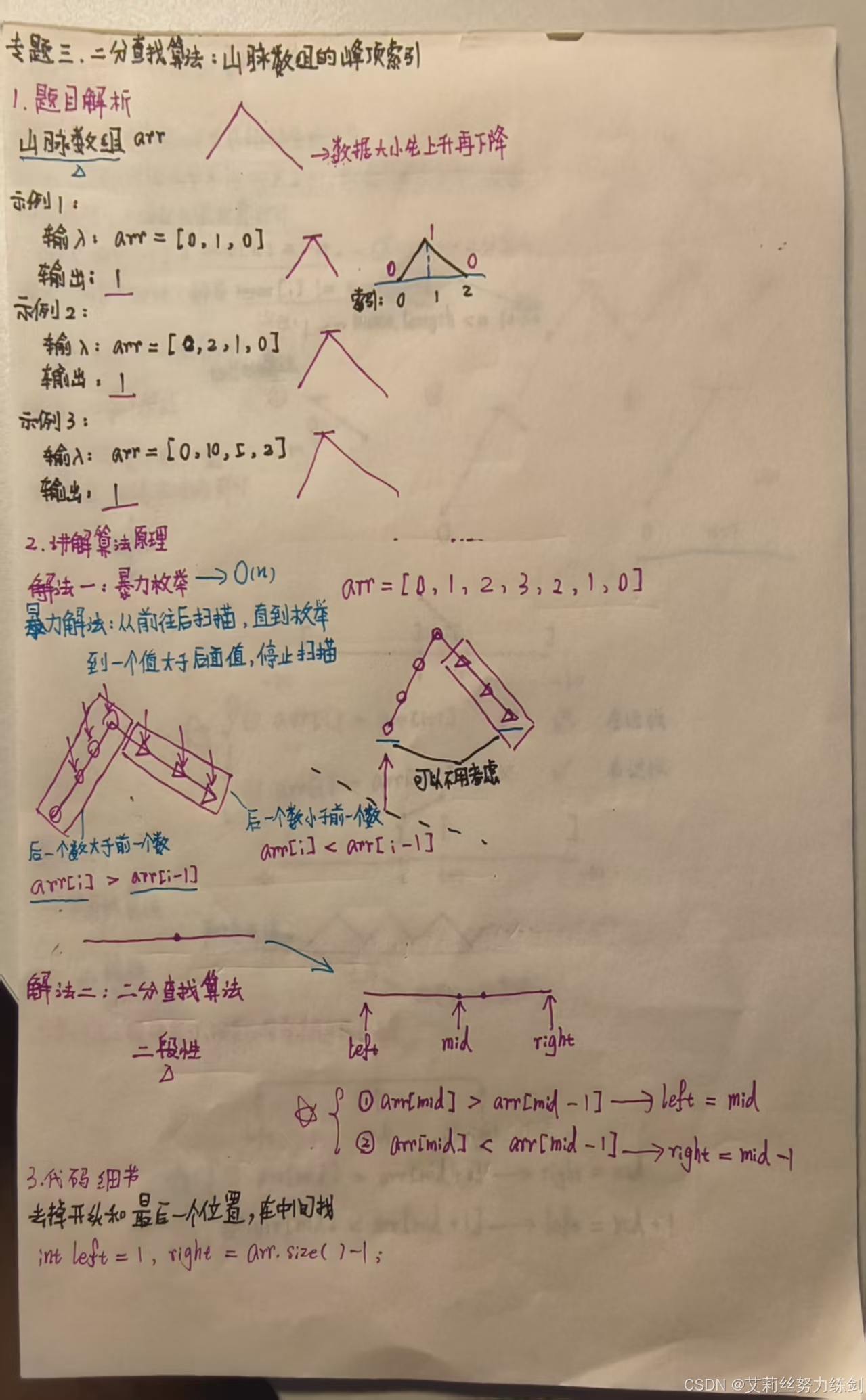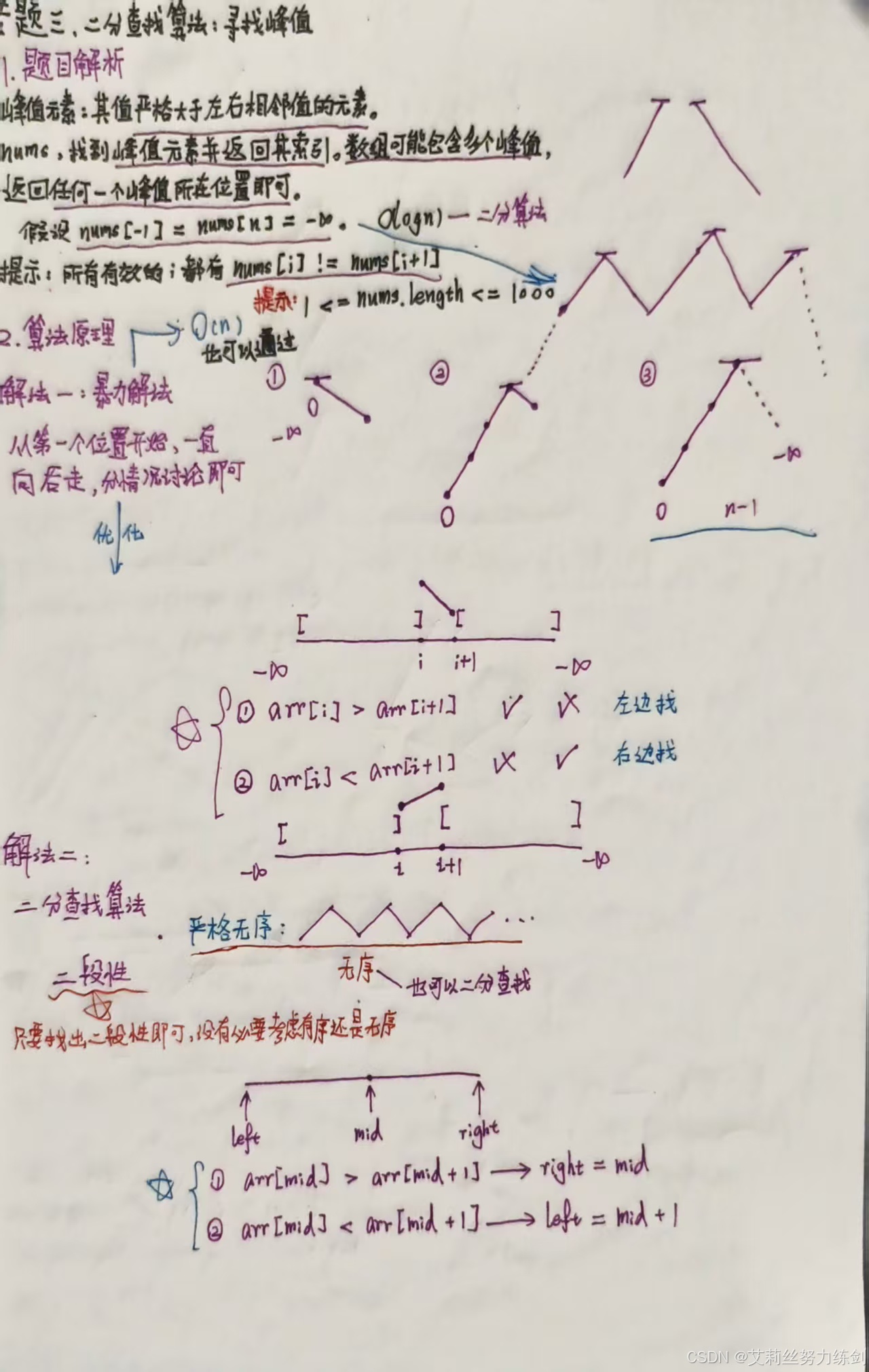 (1)如果mid位置呈现上升趋势,说明我们接下来要在[mid + 1,right]区间继续搜索; (2)如果mid位置呈现下降趋势,说明我们接下来要在[left,mid - 1]区间搜索; (3)如果mid位置就是山峰,直接返回结果。