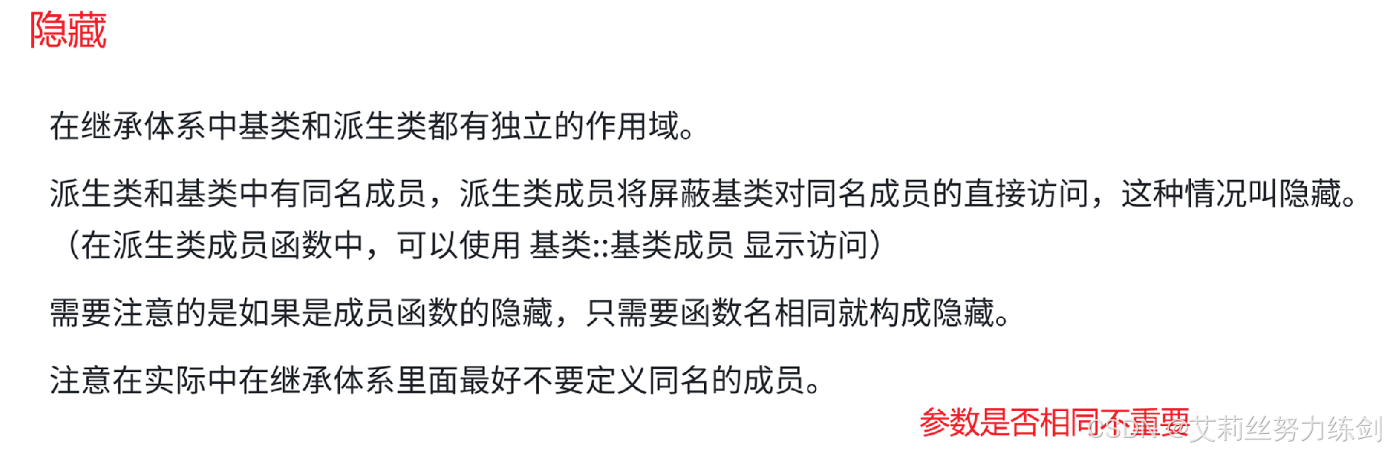 3、实际上面的表格我们进行一下总结会发现,基类的私有成员在派生类都是不可见。基类的其他成员在派生类的访问方式 == Min(成员在基类的访问限定符,继承方式),即取Min(权限更小的),权限是public(公有) > protected(保护) > private(私有)。