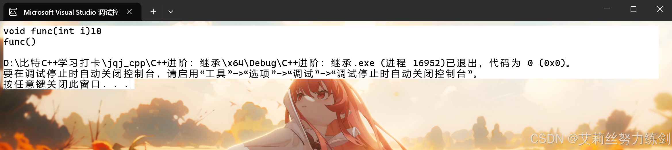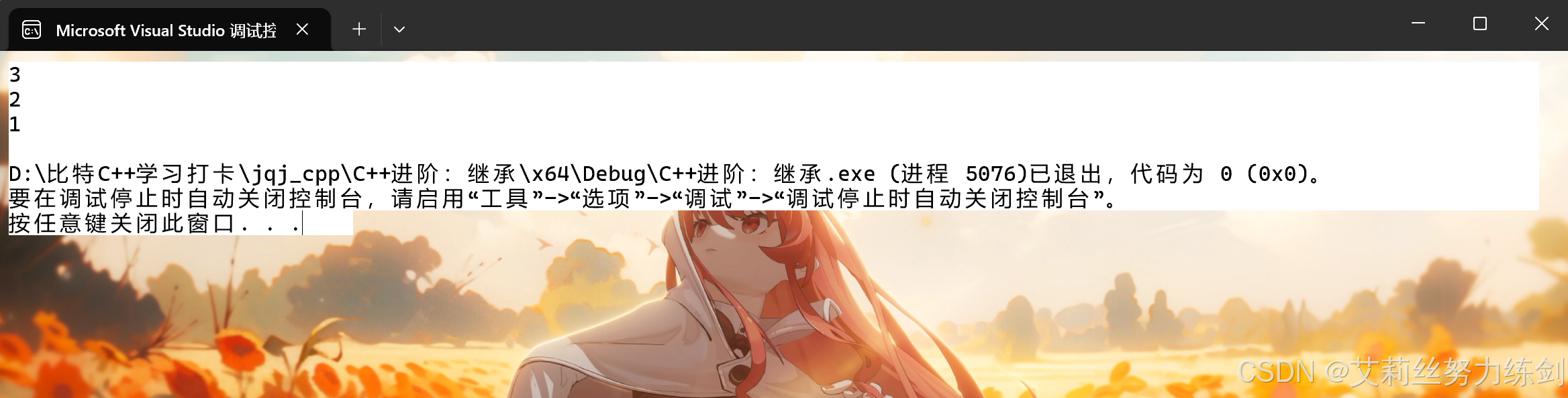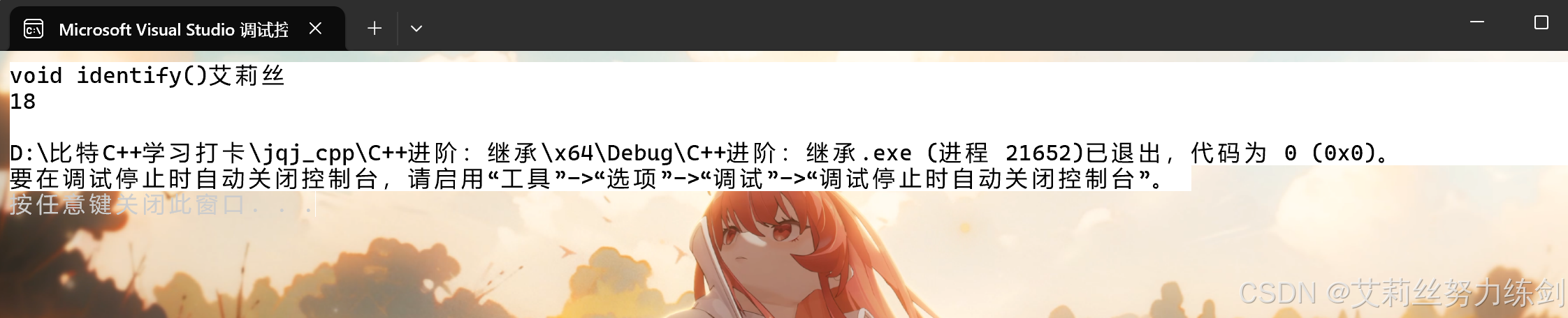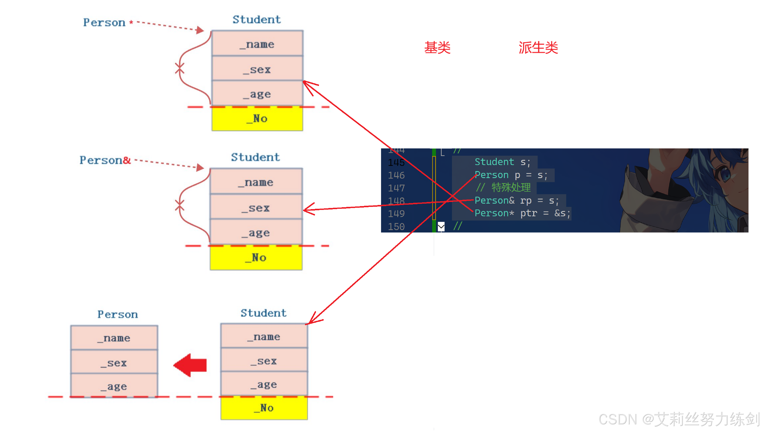 4、基类的指针或者引用可以通过强制类型转换赋值给派生类的指针或者引用。但是必须是基类的指针是指向派生类对象时才是安全的。这里基类如果是多态类型,可以使用RTTI(Run-TimeType Information)的dynamic_cast来进行识别后进行安全转换(ps:这个艾莉丝会在后面的类型转换章节再单独介绍,这里先提一下,我在Linux的开篇——Linux指令那里就提到过“没吃过猪肉还没见过猪跑吗?”,我们先见见猪跑)。