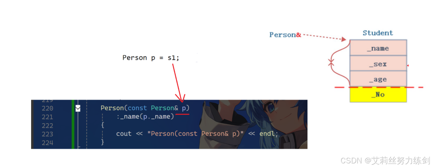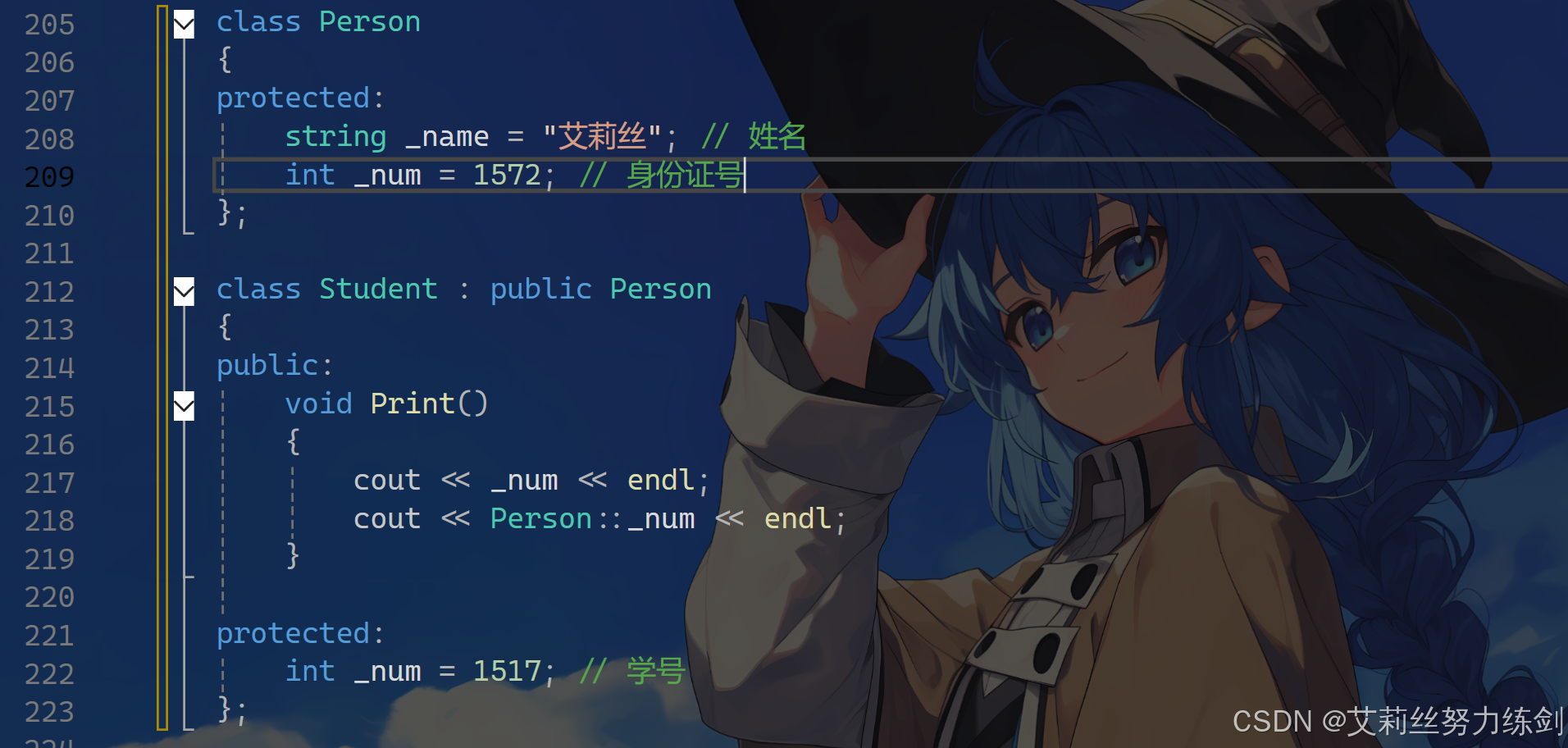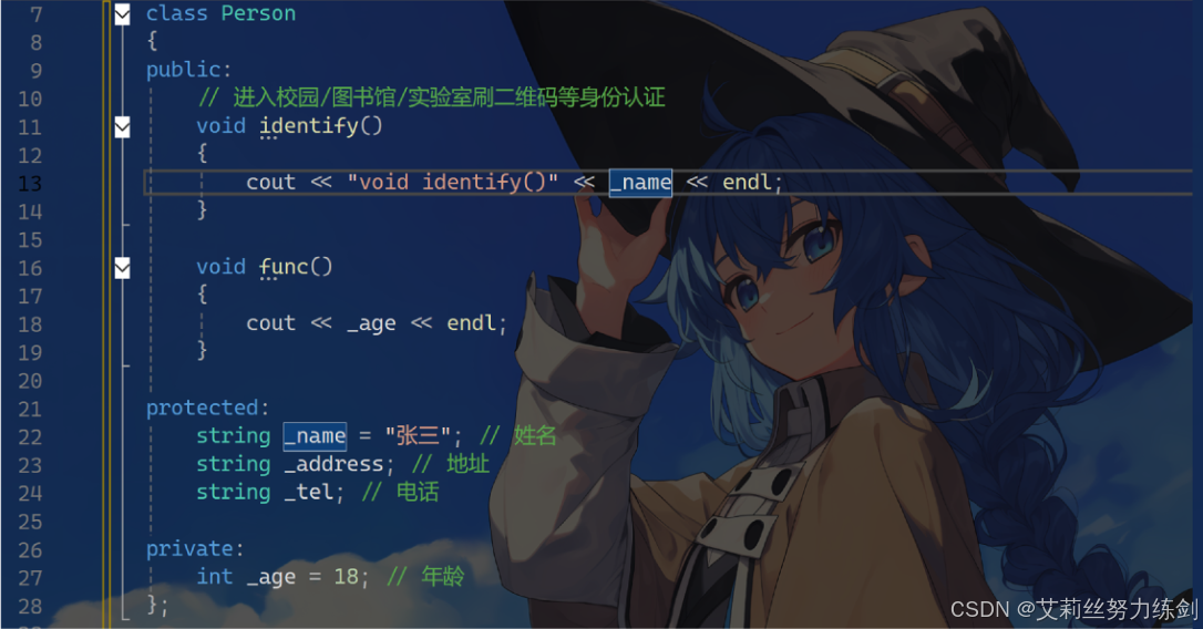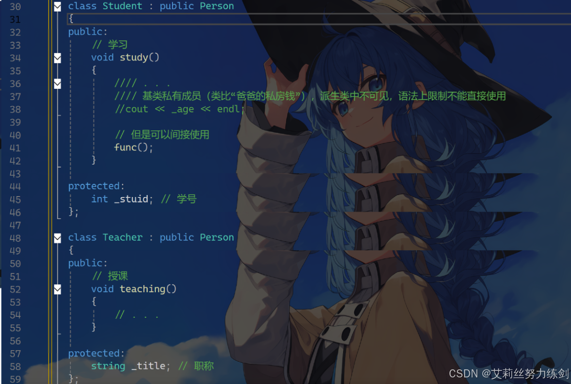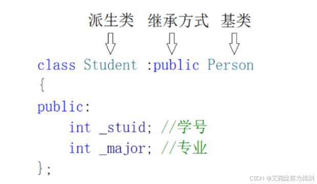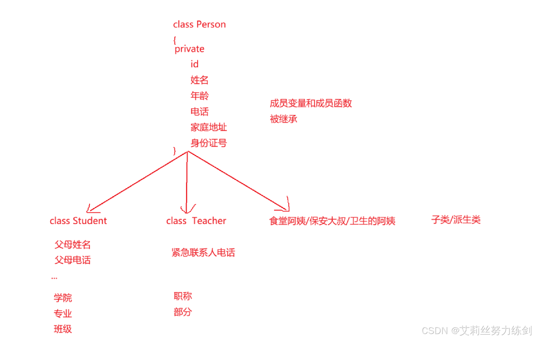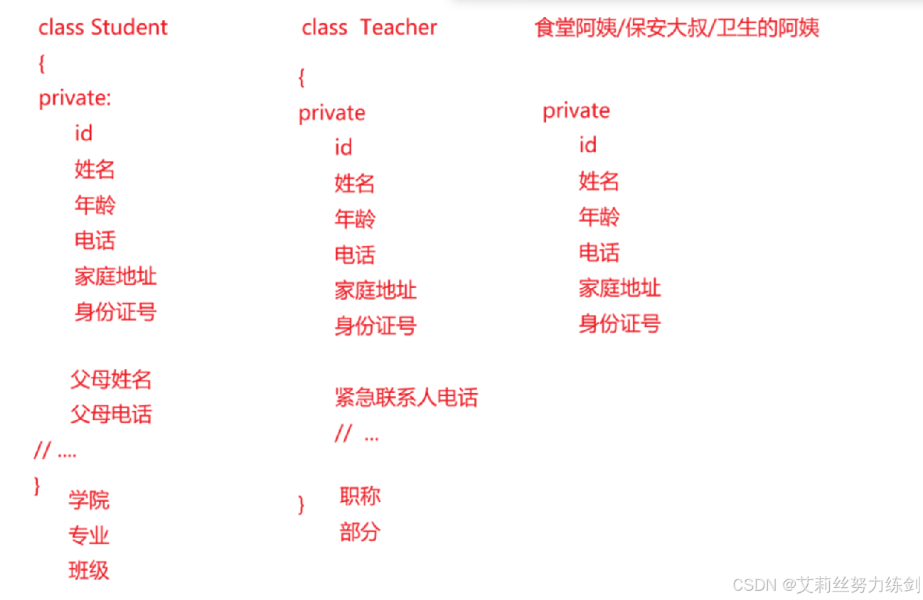 string _name = "艾莉丝"; // 姓名 那我们就把公共的成员都放到Person类中,Student和teacher都继承Person,就可以复用这些成员,就不需要重复定义了,这样省去了很多麻烦——