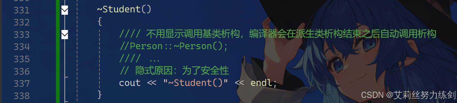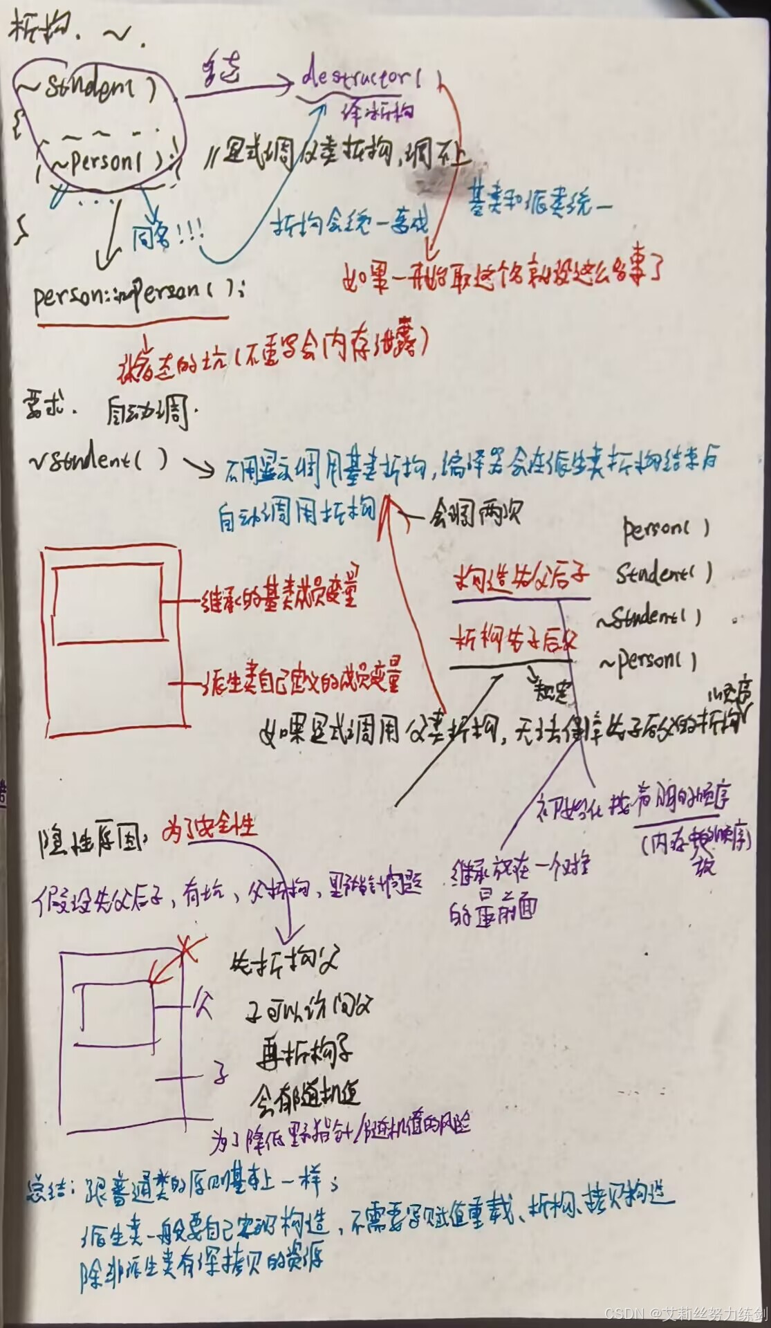 // 派生类一般要自己的实现构造,不显示写析构、拷贝析构、赋值重载,除非派生类有深拷贝的