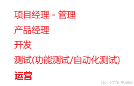 这里既然说到设计了,艾莉丝就插个题外话:虽然我们大多是奔着研发岗 / 测试开发岗 / 测试岗去的,但还是要懂一些产品设计的知识,当然产品设计是由公司里面的产品经理把控的,有些小一点的公司可能人手不够,很多人身兼数职,比如产品经理既是产品经理又是项目经理,甚至于在小公司老板自己可能就是产品经理,这里提到的项目经理已经是管理层了,偏领导,既然都介绍到公司的岗位划分了,我们就再简单了解一下吧——