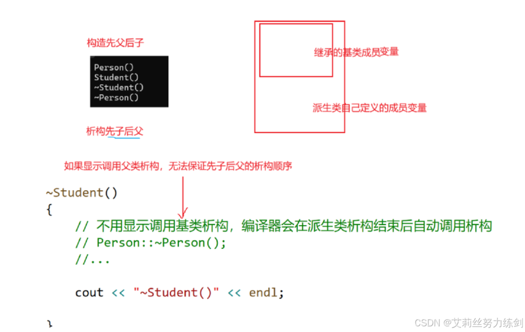 // 继承的基类成员变量(整体对象)+ 自己的成员变量(遵循普通的规则,跟类和对象部分一样)