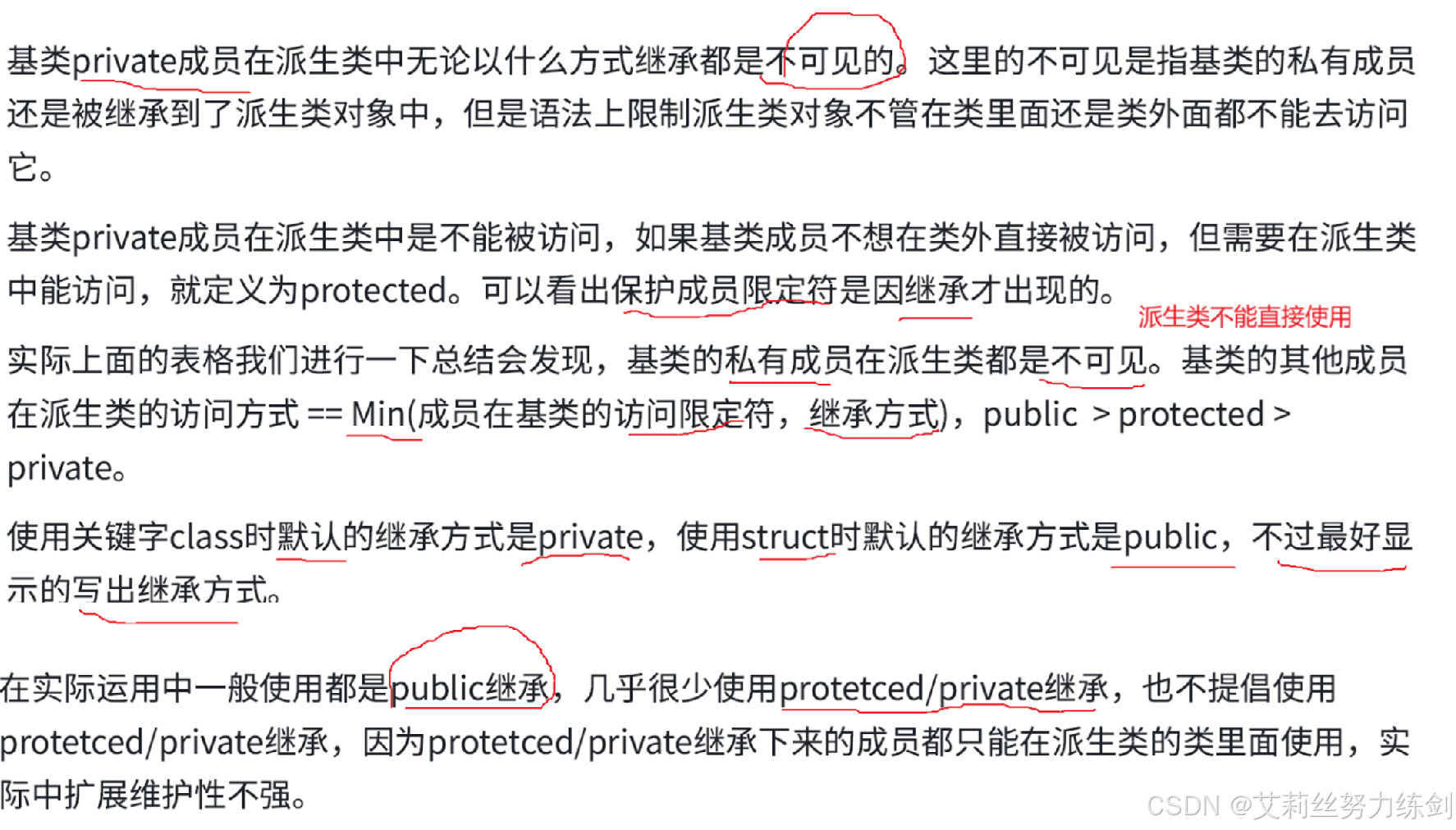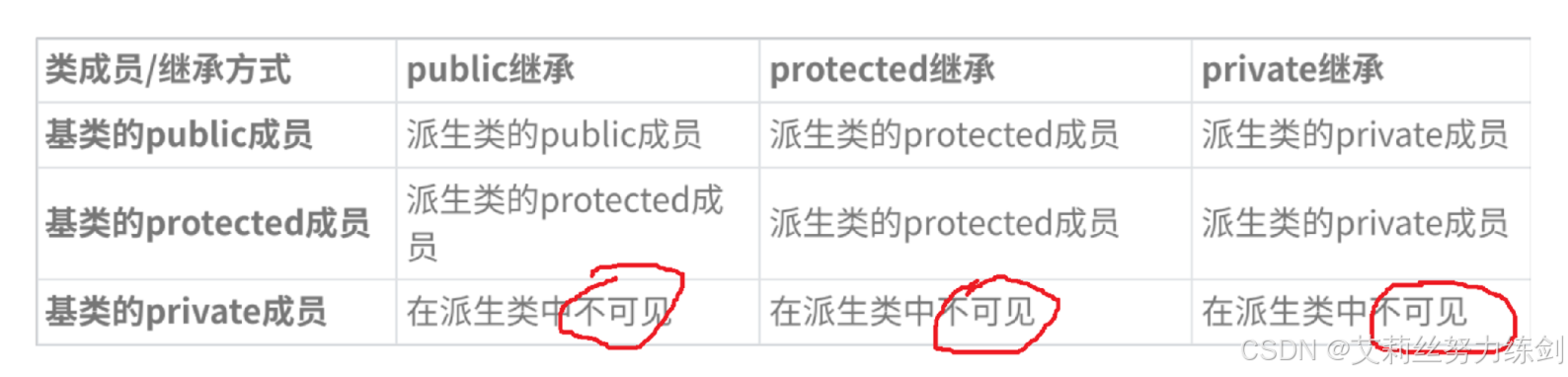 1、基类private成员在派生类中无论以什么方式继承都是不可见的。这里的不可见是指基类的私有成员还是被继承到了派生类对象中,但是语法上限制派生类对象不管在类里面还是类外面都不能去访问它。