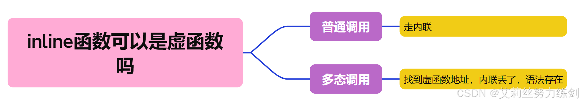 语法上不报错,但是至少说明作为多态调用时到虚表里去找的时候,inline函数的内联属性就丢了——正常函数的调用是call地址,跳转过去调用;内联的特点:跳转过去调用,要建立栈帧,内联就不需要地址,因为内联就是调用那个符合内联属性的函数把内联展开,(当然要符合内联要求:内联要求比较短小)所以没有地址,如果这个是虚函数,虚函数必然是要有地址放进虚表里去走——如果要走多态这条路径调用的话,必然是call一个地址,找到虚表里面——看前面多态,“指向谁调用谁”——虚函数还能是内联吗?因此两个属性不能同时存在。