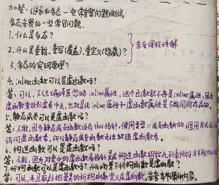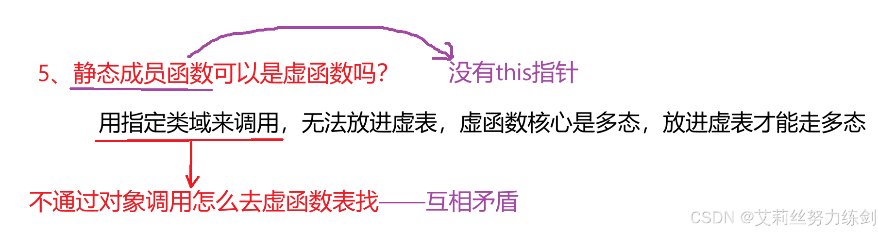 答:不能,因为静态成员函数没有this的指针,使用类型::成品函数的调用方式无法访问虚函数表,所以静态成员函数无法放进虚函数表。