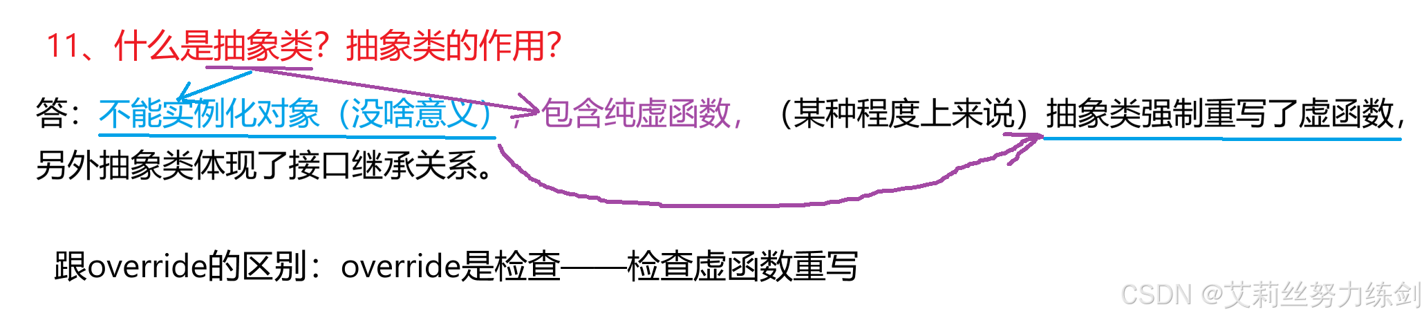 答:不能实例化对象(没啥意义),包含纯虚函数,(某种程度上来说)抽象类强制重写了虚函数,另外抽象类体现了接口继承关系。