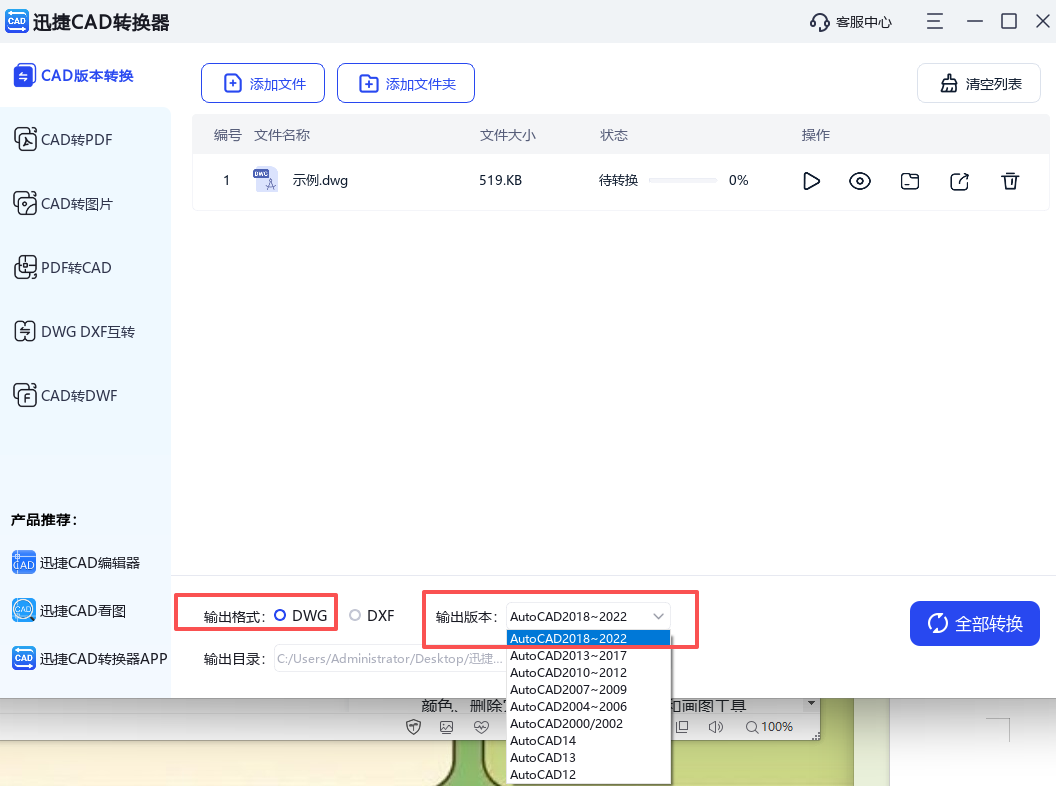 打开工具后,在首页选择【CAD版本转换】功能,上传需要查看的 DWG 文件,选择合适的输出版本和格式,设置保存路径后启动转换,完成后就能直接查看文件。