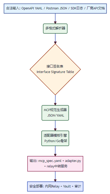 • 目标:在完全合规前提下,构建“格式读取 → MCP规范 → 适配器代码”流水线,5分钟内把公开文档/Postman导出转为可运行Python adapter。