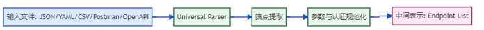 2. 解析阶段:使用多格式解析器提取端点、参数、认证方式与示例响应。
